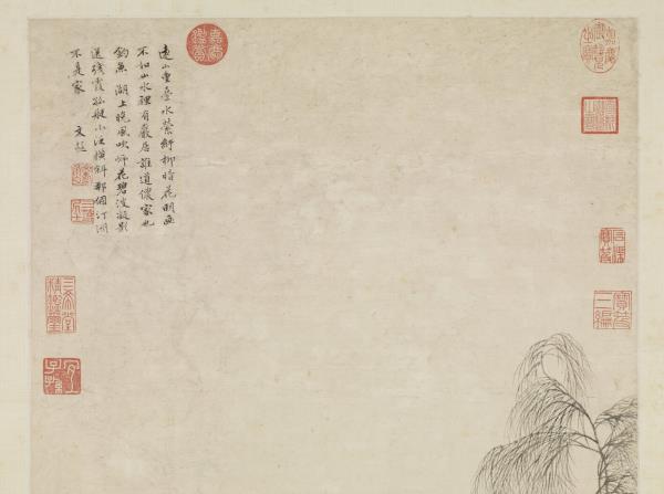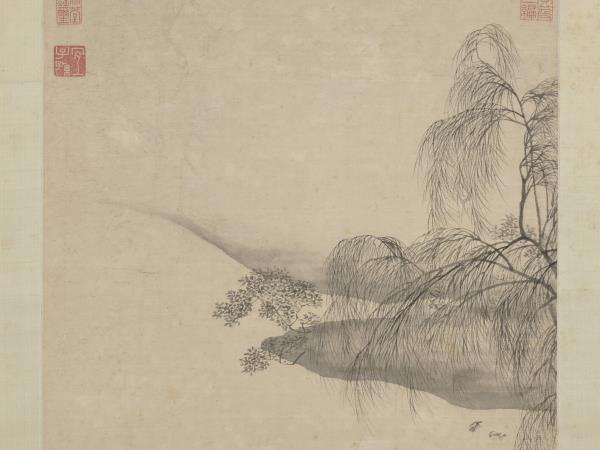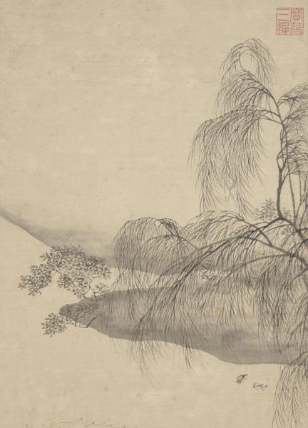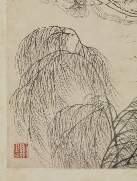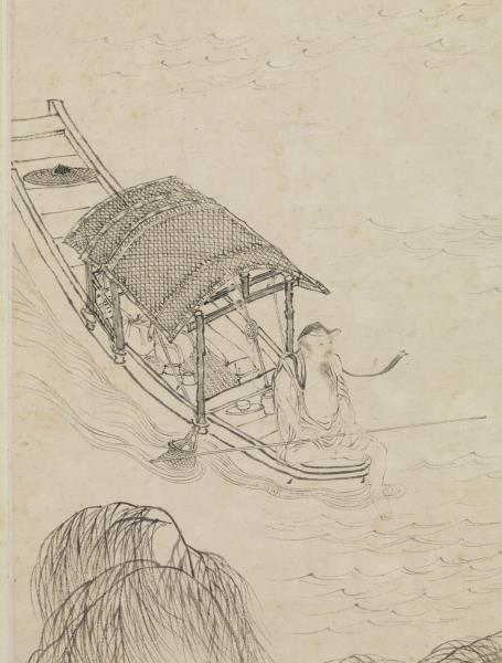 仇英(約西元一四九四-一五五二年),江蘇太倉人。字實父,號十洲。年青時曾為漆二.後遇周臣,經其指授,漸有名於藝壇。工畫山水、人物,為明四大家之一。 楊柳夾岸,高士頭戴紗帽,袒胸露腹,橫波持竿,臨流濯足。雖然不能確知本幅所畫是何故事,然從形似陶淵明的高士造形和兩岸的柳樹觀之,此圖或意為陶淵明「歸園田居」的生活寫照。本幅細筆白描,雅逸秀麗,頗富文人氣息。