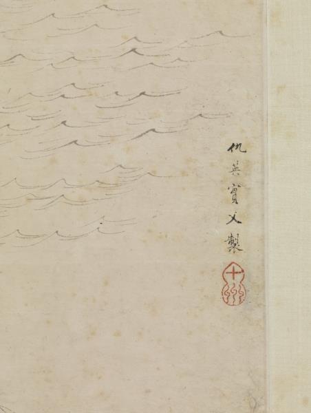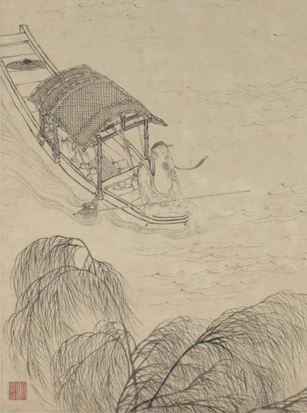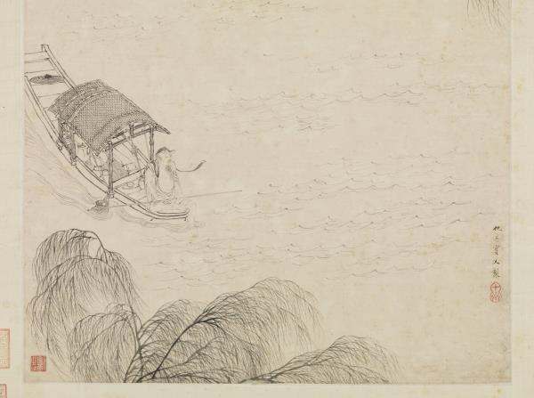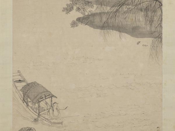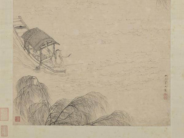仇英(約一四九四-一五五二),字實父,號十洲,江蘇太倉人。年青時曾為漆工,後遇周臣,經其指授,漸有名於藝壇。工畫山水、人物,兼善花卉、鳥獸、傳世蕃馬之作,亦復不少。 高士做陶淵明打扮,坐於小艇,橫波持竿,臨流濯足,垂楊兩岸,岸側有鴛鴦一對,戲浴水際。本幅所畫雖不能確知是何故事,但以高士之造形,兩岸柳樹之聯想,可視為陶淵明「歸園田居」的悠閒生活寫照。