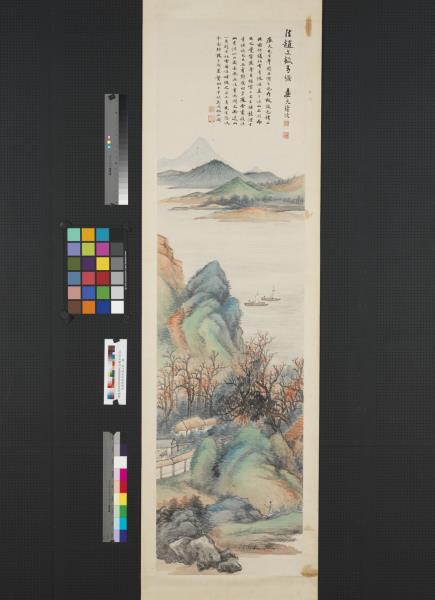 廉夫先生早歲工寫生花卉。故設色精工。此圖仿趙松雪青綠法。蓋自漁山上溯而出。尤覺富麗奪目。惟當日因生楮鬆澀。于青綠設色不無有難應心手處。余曩獲漁山青綠仙山圖。因參其法。重為潤色。而遠山一角則用松雪翁法補綴之。庶不負先生落紙本意。非敢自我累贅也。甲申(西元一九四四年)秋吳湖帆並識。 |