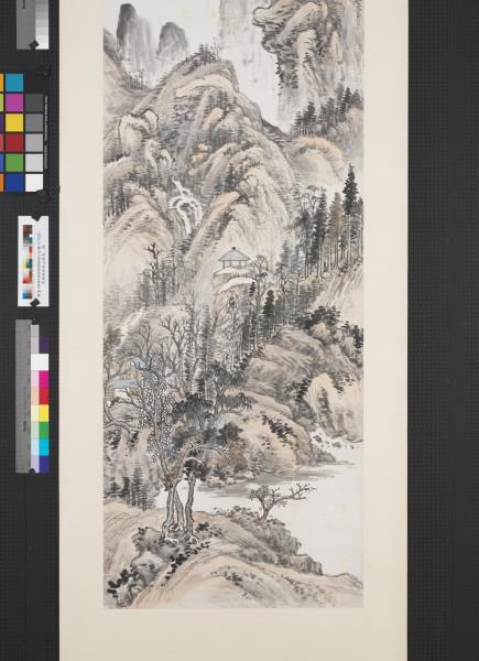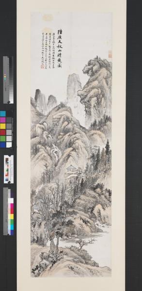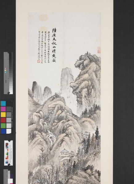 陸廉夫秋山晴爽圖。廉夫先生晚年山水雄濶蕭散。合南田。石谷。麓臺諸家于一罏。此為大屏障四幀之一。未及畢工而逝去。故無題字。丁亥(西元一九四七年)冬日雲伯兄檢遺笥得之。持示屬識為記數言。吳湖帆題。 |