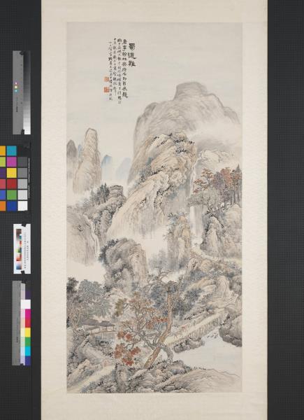 蜀道難。唐李翰林樂府名即以為題。(隸書)。胸中磊磈不能平。幻作崎嶇萬里程。想到中原龍虎戰。千山萬壑起秋聲。丁巳(西元一九一七年)八月三日殘暑未退。吳中陸恢揮汗記。(行書)。 |