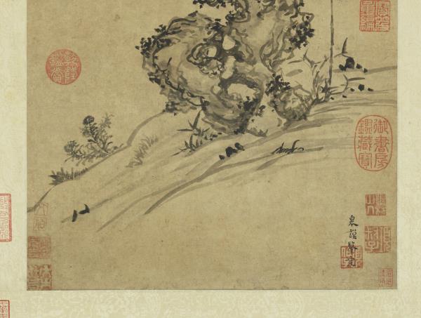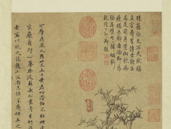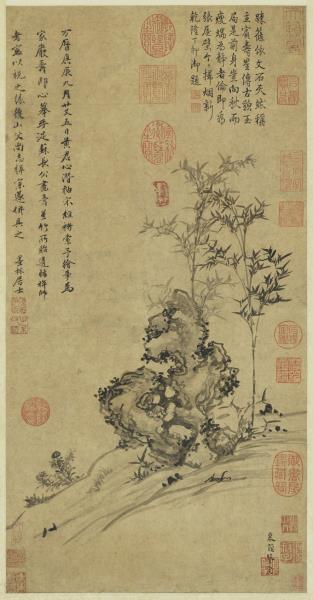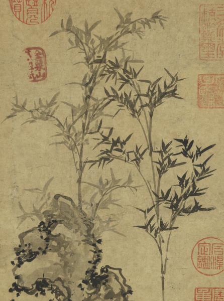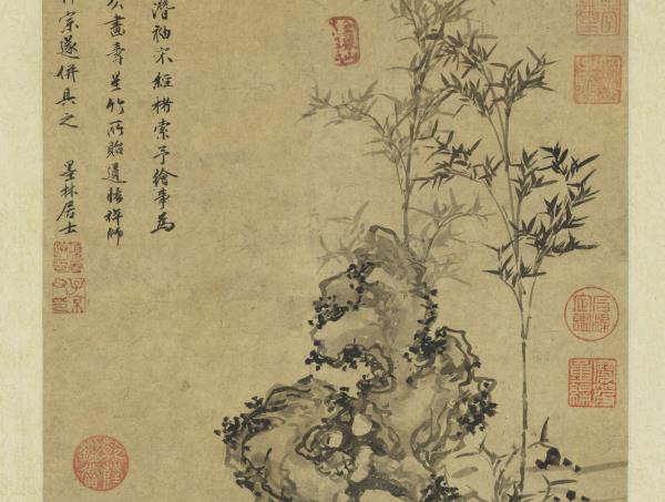 Xiang Yuanbian (style names Zijing, Molin jushi [“Ink Forest Layman”]) was a native of Jiaxing, Zhejiang, who housed his art collection in the Hall of Heavenly Sounds (Tianlai ge). A great collector and connoisseur in Jiangnan, he also learned painting from his collection. In landscapes he studied the Yuan literati styles of Huang Gongwang and Ni Zan, while his plum blossoms, orchids, and bamboo and stones have a great serenity and untrammeledness. This work shows 2 stalks of slender bamboo in tranquil ink by stones on a slope. The brushwork is elegantly plain and straightforward, much in the literati style. Done in 1580 as a birthday blessing for the father of a friend, its authorship was later confirmed by Xiang’s grandson, Xiang Gaomo.
