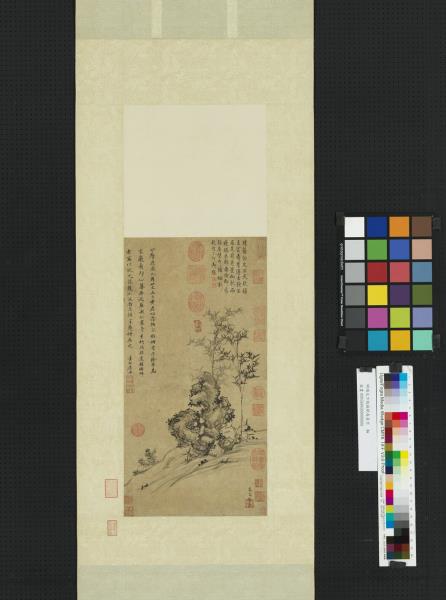 本幅畫兩竿澹墨細竹出於坡石之後,筆法雅淡天真,極具文人畫意。畫成於萬曆庚辰(一五八○年),為賀友人父親壽辰所繪。日後曾經其孫項皋謨鑑定。