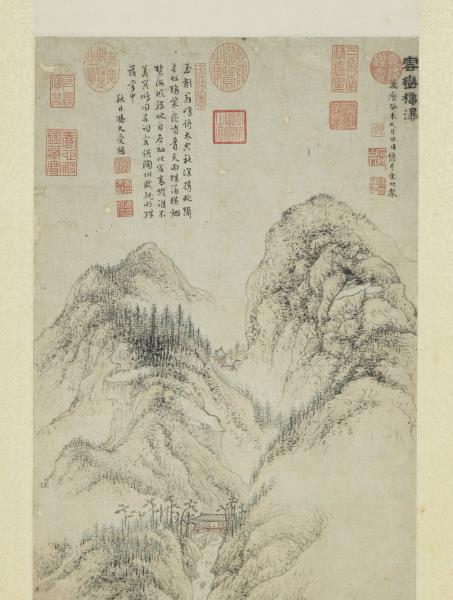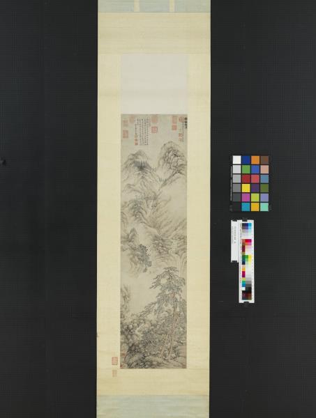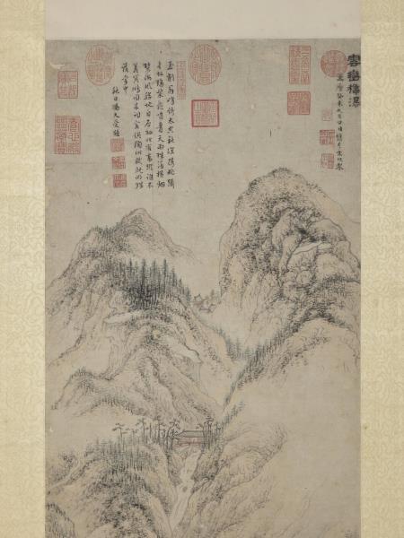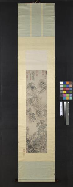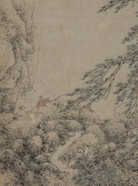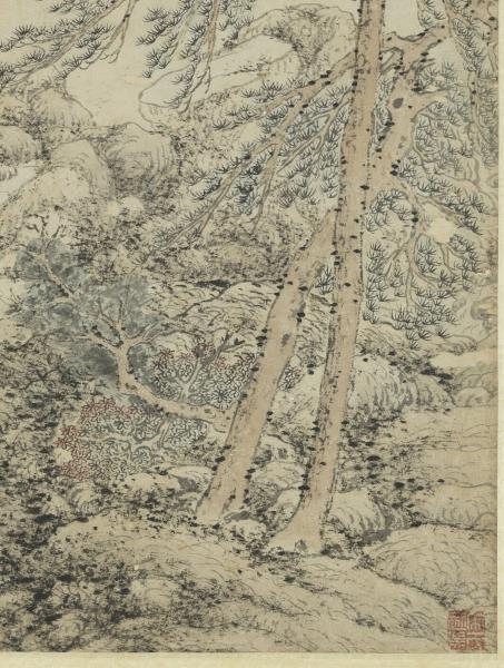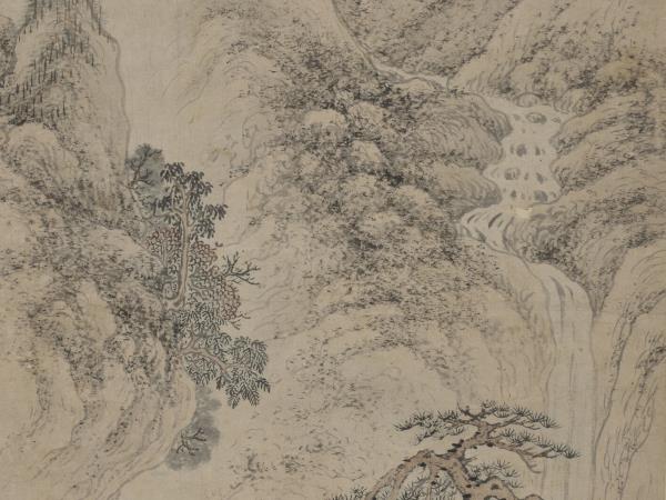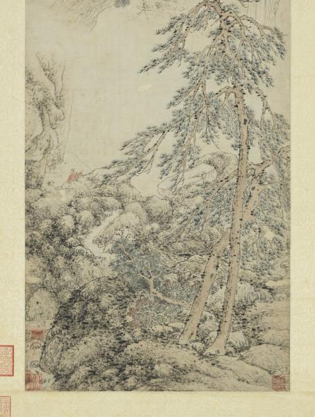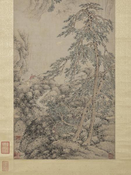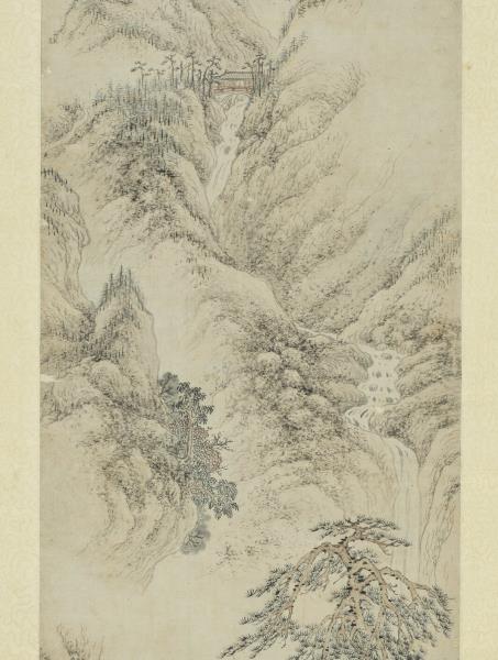 宋旭,(西元一五二三至一六○二)嘉興人,字初暘,號石門。後為僧,法名祖玄。善山水,兼長人物。萬曆間,名重海內。曾繪白雀寺壁,時稱妙絕。此幀成於萬曆癸末,為石門五十九歲作。畫兩峰並峙,一水中分,瀑流迤邐而下。高峰之間,與瀑流之上,有寺宇水閣。其下則高泉遽落,亂石小徑在長松間。兩翁觀泉,指顧而談。皴筆皆用濕墨小牛毛,而以渴苔提破,有疏朗之致。