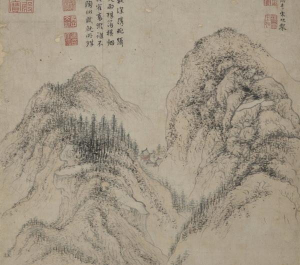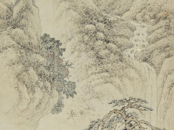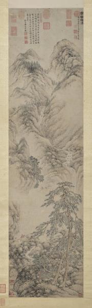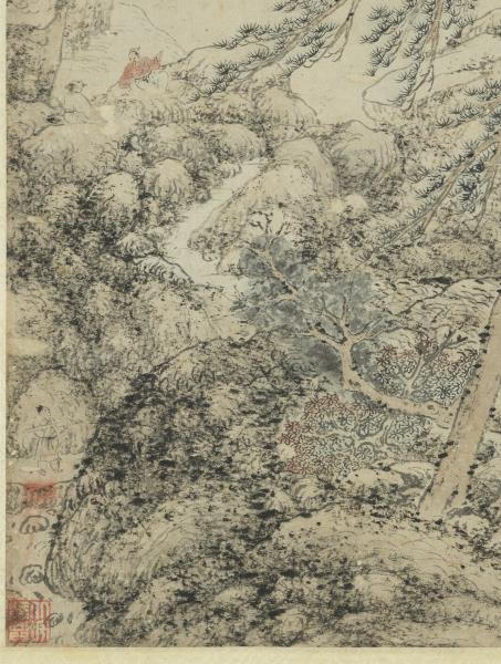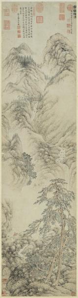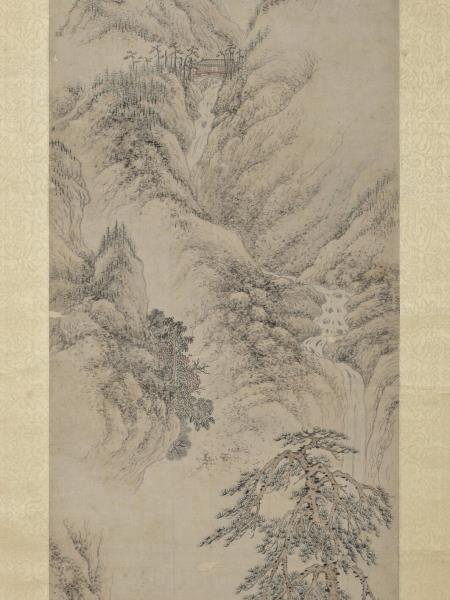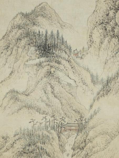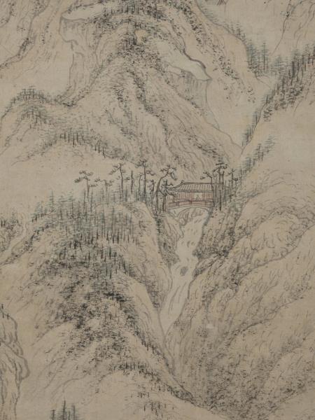Sung Hsu was a native of Chia-hsing (Chekiang province), his style name was Ch’u-yang and his sobriquet Shih-men. In his later years he became a Buddhist monk and adopted the name Tsu-huan. As a painter he was good at landscape and also figure subjects. In the Wan-li period (1573-1620) he achieved nation wide fame and his wall paintings in the Pai-ch’iieh monastery were considered exceptionally marvellous. This work was done in 1583, when the artist was in his 59th year. It depicts mountain ridges rising up into two peaks which seem to bow to one another across the torrent separating them.Through the gorge water cascades down a twisting bed. Between the mountain slopes and over the water sit temple buildings and pavilions. Below, the waters fall suddenly from their high mountain source to where a narrow path winds among tumbled boulders and tall pines. Two old men rest there, watching back to the waterfall and chatting. The painter has used his brush, well loaded with ink, predominently in the technique called “small ox-hair” texture stroke.