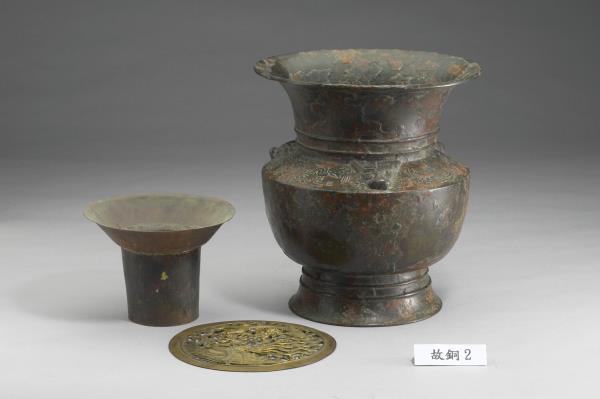 侈口,折肩,腹下略收,圈足,附膽。頸飾弦紋,肩飾三浮雕獸首、蟠螭紋,足飾弦紋。明清時期配作銅膽,以為插花器皿。附鏤空龍鳳紋蓋。