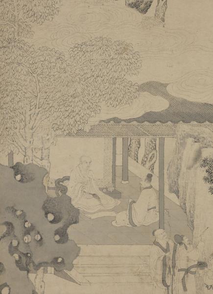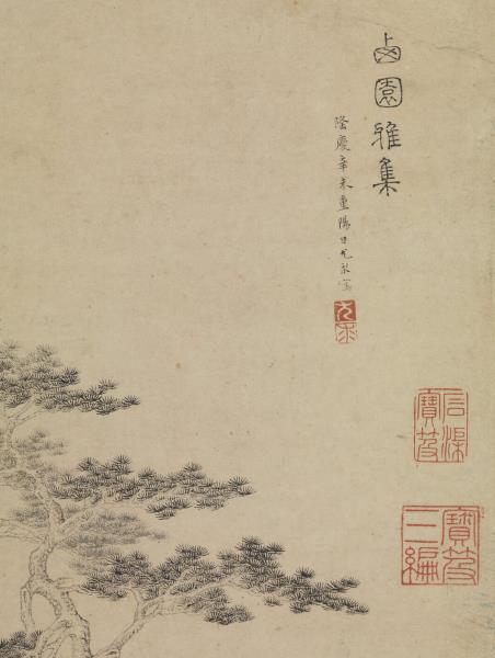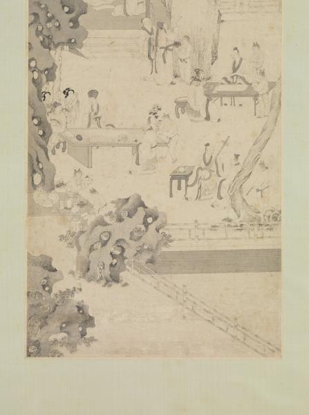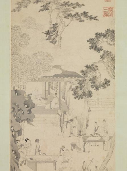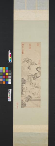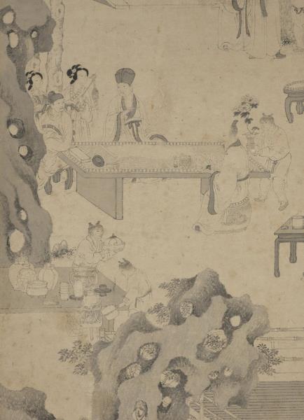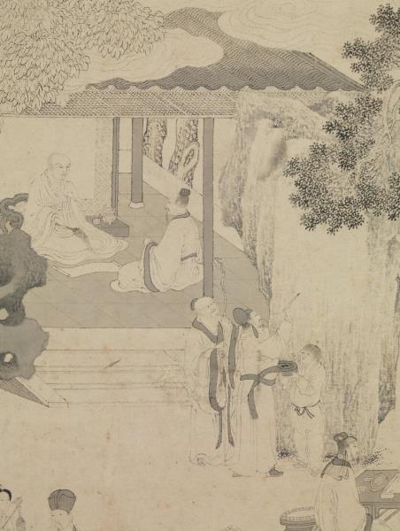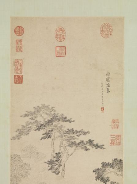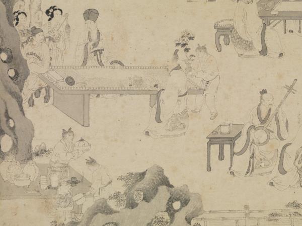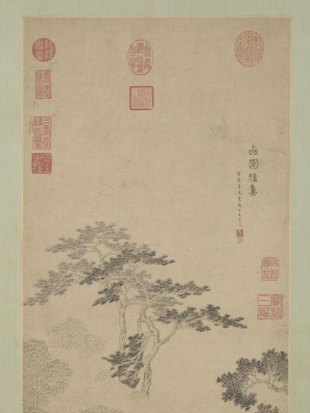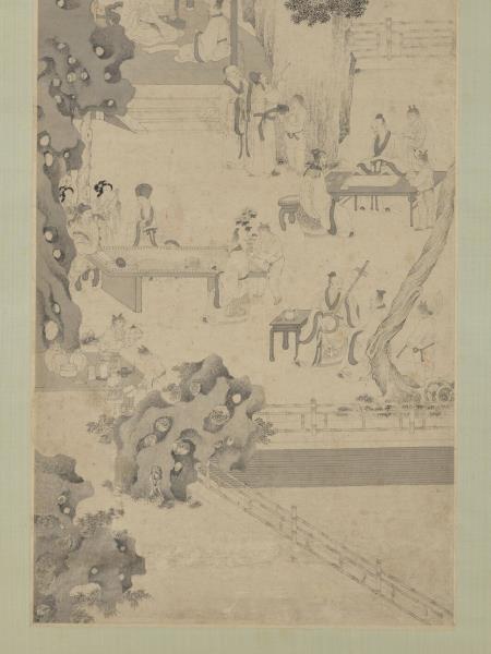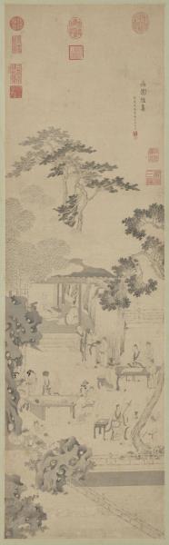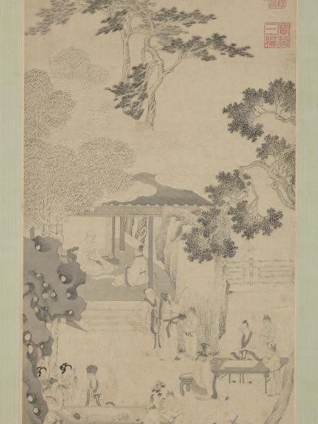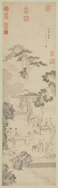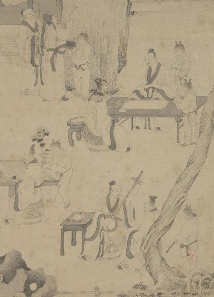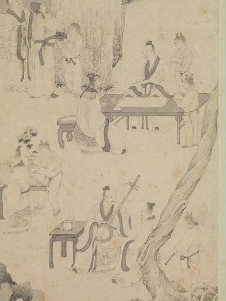 Description This carefully detailed ink painting depicts a famous literary gathering that was held in the Western Garden of Wang Shen (ca. 1048-ca. 1103), a noted Sung dynasty literati. Included among the guests are such celebrated talents as the man of letters Su Shih (1037-1101), the calligrapher and connoisseur Huang T’ing-chien (1045-1105), the painter Mi Fu (1052-1107), the poet and calligrapher Ch'in Kuan (1049-1100), and the poet Ch'ao Pu-chih (1053-1110). Mi Fu, who also made a written record of this gathering, is pictured here in the very act of doing so: he stands before a natural rock stele, hurriedly scribbling a colophon that would become a lasting memorial to this occasion. Yu Ch'iu, a native of Ch'ang-chou (present-day Soochow, Kiangsu), later moved to T'ai-ts'ang, Kiangsu. He excelled at landscapes and paintings of human figures. In the latter genre he emulated--but did not equal--the works of Liu Sung-nien (fl. ca. 1190) and Ch'ien Hsuan (b. 1225).