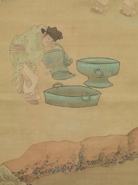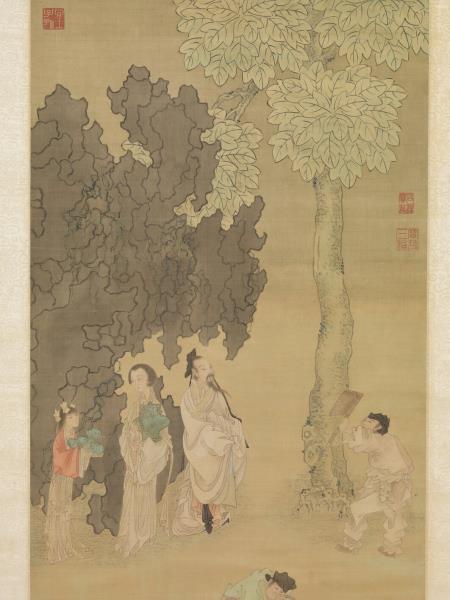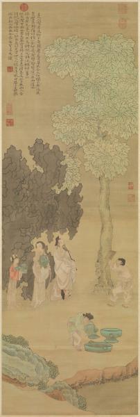 崔子忠(西元?-1644年),北平人。初名丹,字開予;更名後,字道母,號北海,又號青蚓。崇禎時順天諸生;甲申後入土室不出,卒餓死。善畫人物,與陳洪綬齊名。 倪雲林性好潔,庭中所植梧桐,常督童僕洗滌,後世遂有洗桐圖,相傳以為佳話。此幅綾本潔淨如新,人物用筆傳神,皆極雅秀。畫樹畫石,有圖案意味,蓋崔氏作畫,於其意象,故別有蹊徑也。