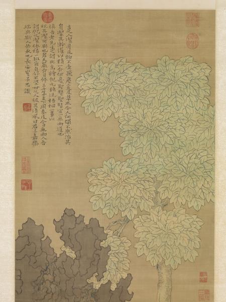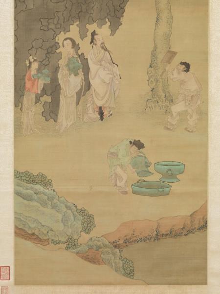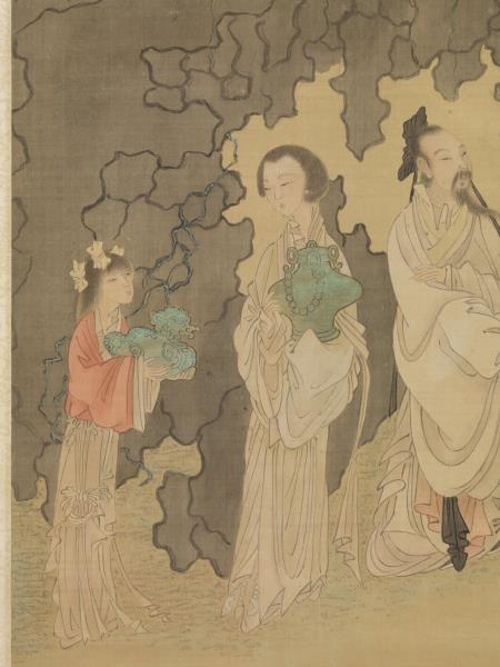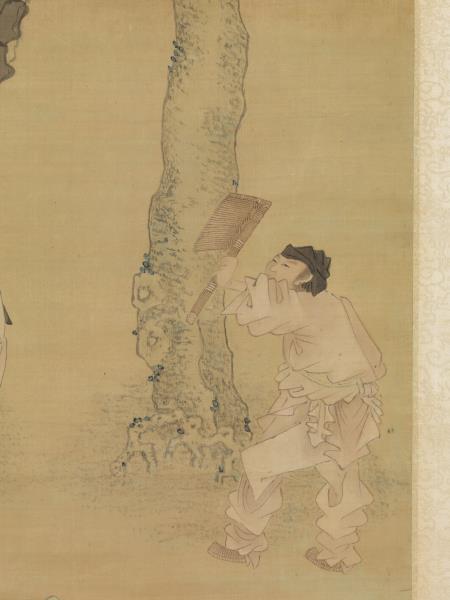 Ts’ui Tzu-chung was a native of Shantung who adopted Peking as his home. He was a highly learned and patriotic man. When the Ming court fell to the Manchus in 1644, Ts’ui secluded himself in a mud hut and chose to starve to death rather than to survive under the new regime. He excelled at painting figures, and his fame rivals that of his contemporary, Ch’en Hung-shou (1598-1652). A flourishing Wu-t’ung (firmiania) tree grew in the Yuan dynasty master Ni Tsan’s (1301-1374) garden. As Ni Tsan was devoted to cleanliness, it became Ni’s habit to accompany a servant to the garden to bathe the leaves of the Wu-t’ung tree. This ritual became the popular subject of many later paintings such as this one by Ts’ui Tzu-chung. The condition of the silk in this work is immaculately new. Ts’ui’s brush has captured a vital spirit in the figures in an extremely refined style. The rocks and trees have been exploited for their design qualities in a manner which has become a true signature of Ts’ui’s hand.
