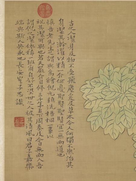 古之人潔身及物。不受飛塵。爰及草木。今人何獨不然。治其身。潔其澣濯。以精一介。何憂聖賢。聖賢宜一。無兩道也。慎吾老先生之謂與。為繪倪元鎮洗梧桐一事。以祝其潔可與也。若夫嚴介自修。三千年上下周秦。及今日無兩人。吾謂倪之潔。依稀一班爾。自好不染。世之人被其清風。曰君子嘉樂。端與斯人共永也。長安崔子忠識。 |