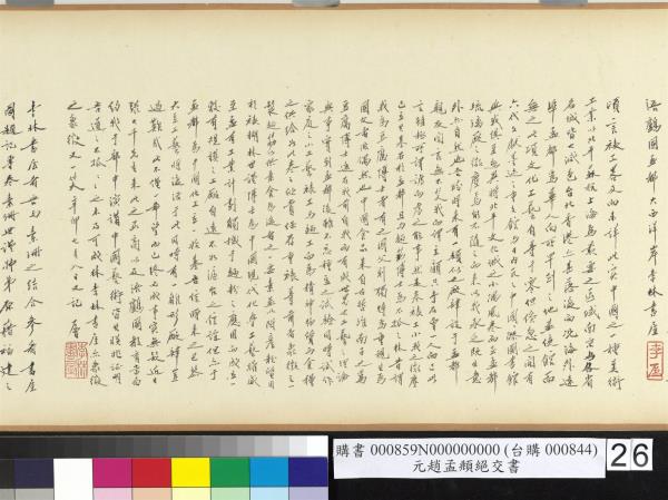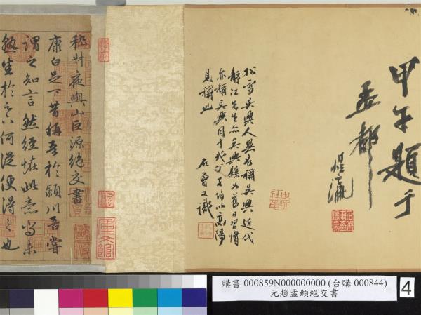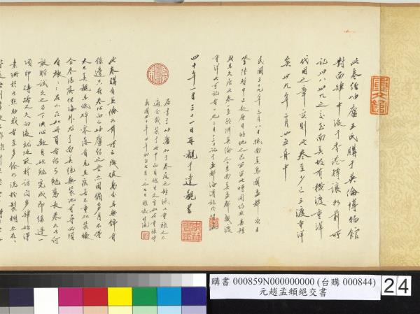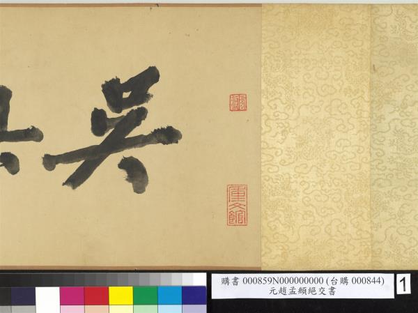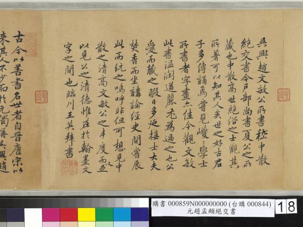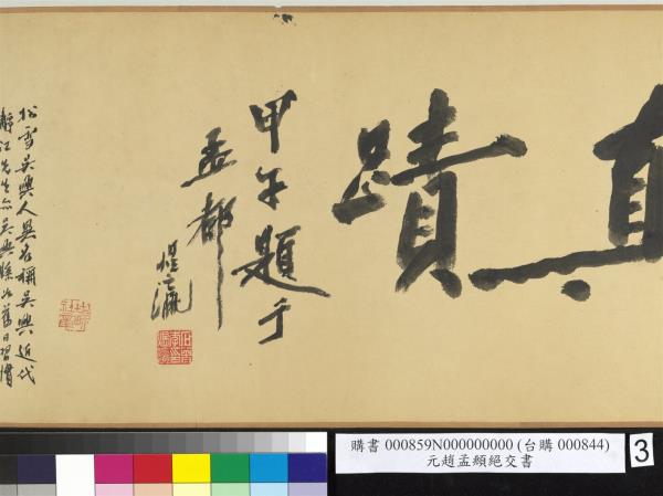 趙孟頫墨跡。字子昂號松雪。吳興人。亦稱吳興宋宗室。元承旨諡文敏。李煜瀛。民國四十年(西元一九五一年)重裱並題。 |