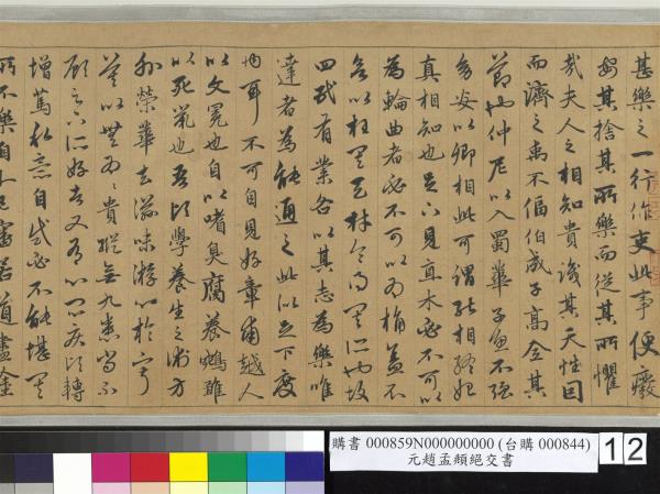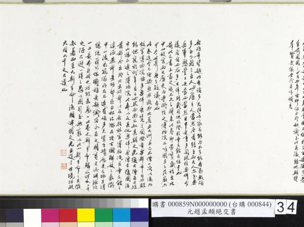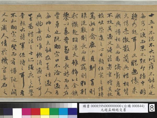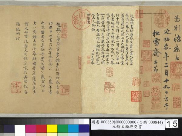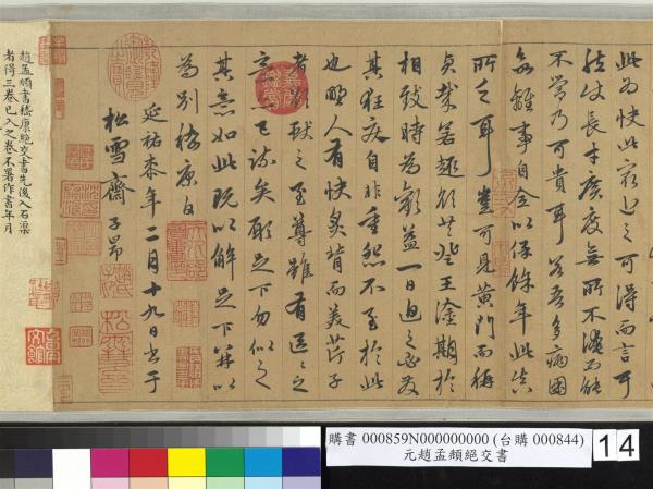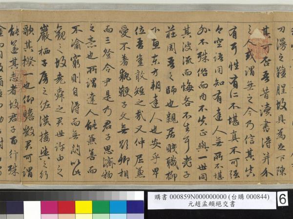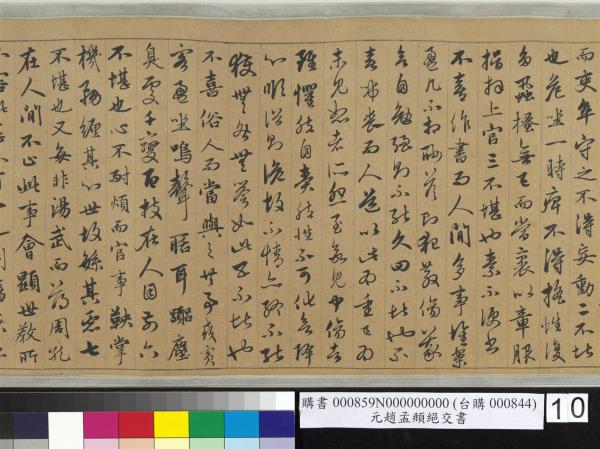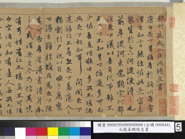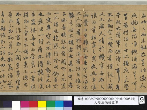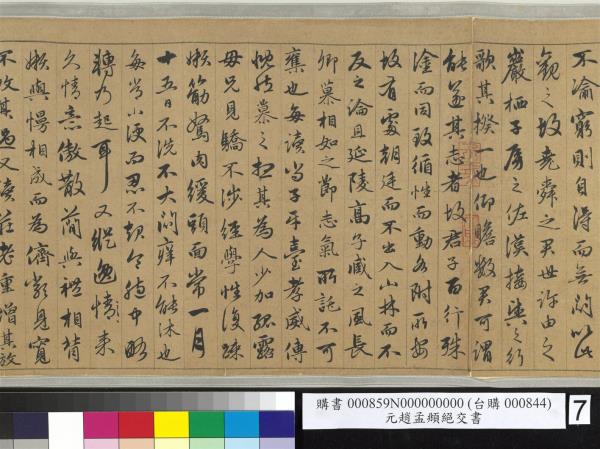 趙孟頫書嵇康絕交書。先後入石渠者得三卷。已入之卷。不署作書年月。蒼秀圓勁。足規二王。已橅刻三希堂帖中。續又得二卷。一署延祐六年(西元一三一九年)。此卷署延祐七年(西元一三二0年)。精采亦不減已入卷。想孟頫當時愛康此書。再三泚筆。亦如虞世南謂王子敬好寫洛神。人間合有數本。毋庸作分別相也。乾隆乙巳(西元一七八五年)孟冬。御識。臣彭元瑞奉勑敬書。 |