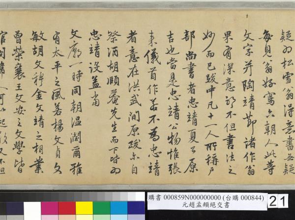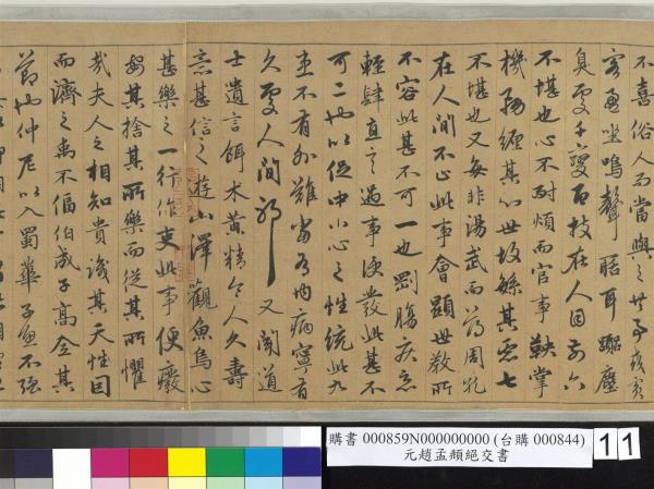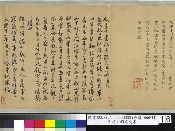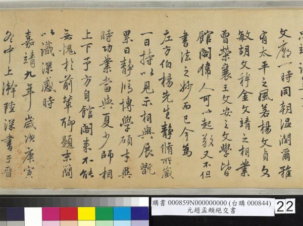 跋嵇叔夜絕交書。此卷真行為松雪翁書無疑。為松雪翁得意書無疑。每見翁好寫六朝人此等文字。并陶靖節諸作。翁果有深意耶。不但書法之妙而已。跋中凡十一人。所稱戶部尚書者。忠靖夏公原吉也。當是忠靖公物。惟張來儀首作 。若不為忠靖者。意在洪武間原跋爾。自祭酒胡頤菴先生而下。皆為忠靖設。蓋當文廟一時同朝。溫潤爾雅。有太平之風。若楊文貞。文敏。胡文穆。金文靖之相業。曾榮襄王文安之文學。皆館閣偉人。可以起敬。又不但書法之妙而已。今為左方伯楊先生靜脩所藏。一日持以見示。相與展翫累日。靜脩博學。碩才異時。功業當與夏少師相上下。予方自館閣來。不能無愧於前輩。聊題末簡。以識深感。時嘉靖九年(西元一五三0年)歲次庚寅冬中上澣。陸深書于晉陽之河汾書院。 |