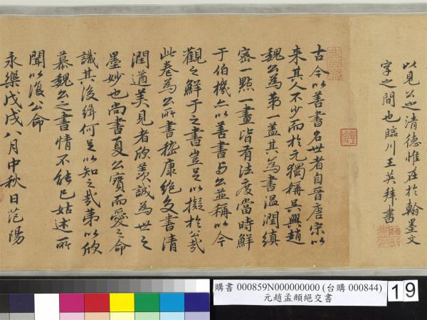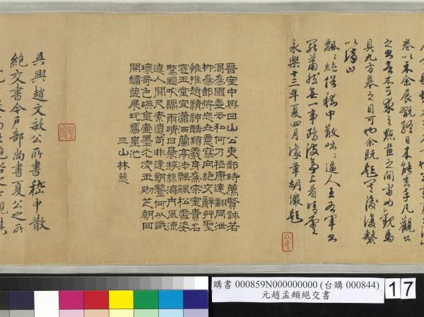 吳興趙文敏公所書嵇中散絕交書。今戶部尚書夏公之所藏也。中散高世絕俗之士。觀其所著。可以知其人矣。世之好古君子多傳誦焉。嘗見巎巎學士所書者。字畫亦佳。今觀文敏此書。溫潤遒麗。尤為過之也。公愛而藏之。暇日多延接士大夫。焚香而坐。講論經史間。嘗展此而玩之。嗚呼。非但可想見中散之清高。文敏公之丰度。而又足以見公之清德。惟在於翰墨文字之間也。臨川王英拜書。 |