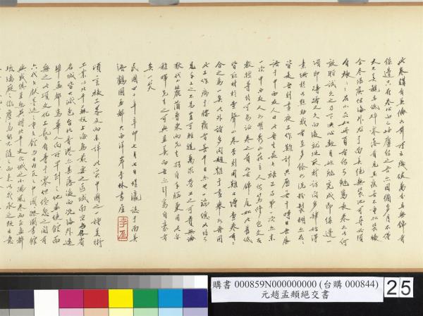 頃言裱工略及而未詳。此實中國之一種美術工業。以北平蘇杭上海為最要之區域。南京與各省名城皆大減色。台北香港亦甚落後。而況海外遠埠孟都。為華人向所罕到之地。並使館而無之。此項文化工藝自等于零。但倏忽之間。有六代文獻墨迹之重文館。與日內瓦之中國國際圖書館與我俱至。無異將北平文化城之小隅。風卷而至孟都。琉璃廠之微塵焉能不隨之而來。以我承乏既出意外。亦自然也。吾盼將來有一類似之廠肆設于孟都。親友聞言無不笑我。而謂主顧只李石曾一人而已。此言雖極所謂謔而虐之能事。然是卷裱工小我之微塵。已立其基石於孟都。且與麵筋博士為不孤之林。昔謂我為豆腐博士者有之。國父則獨特為重視。其為國父者非偶然也。中國食品來自古哲。淮南子之為豆腐博士。遠在我前。自我而有成世界大工藝之理論與事實。到孟都後。雖不忘種豆之試驗。同時試作家庭之小工藝裱工與麵工。而為精神物質兩食糧之供給。如此卷之欣賞保存重裱等。前者象徵之一。製麵筋以供素食。為後者之一要素。並以附產粉質用於裱糊。林世謹博士為中國現代化學工藝權威。至孟有工業計劃。觸機于麵粉之應用。而成立一較有規模之工廠。自遠不如滬台之信誼。但亦于孟都為中國化工立一始基。吾信將來之巴黎大豆工藝將復活于此。同時有一雛形廠肆。豈過難哉。此不僅一希望而已。終必成事實無疑。近日張大千先生來此之函商。以及浯鸕國教育當局約我于部中演講中國藝術。皆其朕兆。證明吾道之不孤。不孤之木乃可成林。李林書屋亦象徵之象徵。又一笑。辛卯(西元一九五一年)七月八日又記。石曾。 |