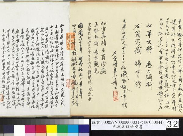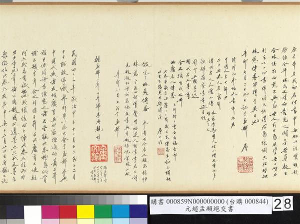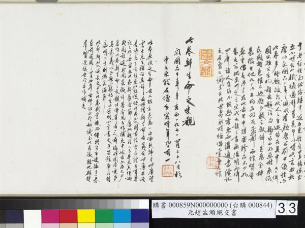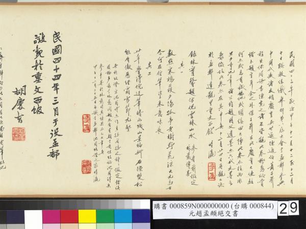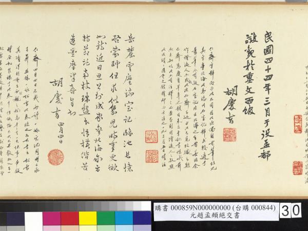 仁齋四月四日。示我兩詩。一詠宋沈周冊。已承子昇照錄。一詠松雪此卷。臨之如右書之松雪真蹟。得於重文西館觀之。視為平生一大快事。本擬將原札裝裱于此卷中。惟紙幅太大。不果。擬加入另一松雪書畫墨迹冊中。於館之文藝文獻兩重關係。增益殊多也。四十四年(西元一九五五年)四月九日。煜瀛臨注於孟都。 |