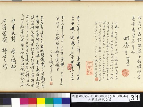兩年前特品珍品。唐宋元明清民國六代文獻墨迹西東館巡迴。由孟都至台北。初暫存于中央信託局保險櫃中。近而東館自置能保至五小時火。小鐵櫃遂移置其中。以時代言始於唐。以民國六十年(西元一九七一年)之現代。有顏魯公劉中使帖。與此卷多種題跋。六代人之手迹均在其中。又二件國父孫公手札。稚老題注與靜公山水畫冊。象徵民國特色。雖不過極少數之幾件。足為全體象徵。其他九十以上物品。仍在孟都西館。質量兼重。但無過于在此前。其中特要珍品不少。如朱文公。沈泉州之于宋代。又趙之書畫陽明兩件。四庫諸人自均不能忽者。東西溝通當續記之。石曾又識于台北世界社所恆傑堂重文館。 |
