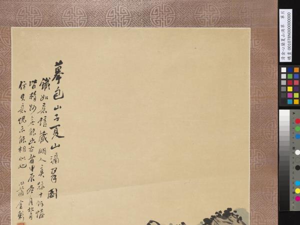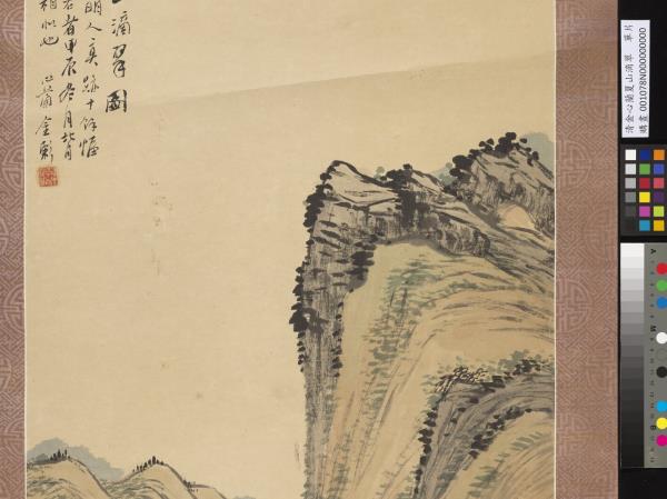 | 作者款識 | 金心蘭 | 本幅 | 摹包山子夏山滴翠圖。鐵如意館藏明人真跡十餘幅。皆精妙無能出右者。甲辰(西元一九0四年)冬月背仿其意。愧未能相似也。心蘭金湅。 | 行書 |