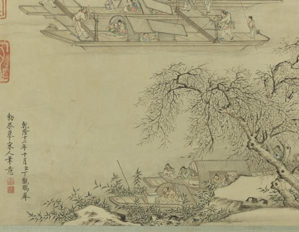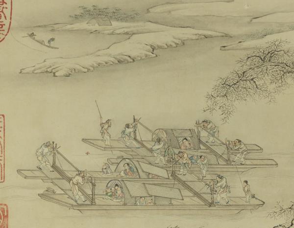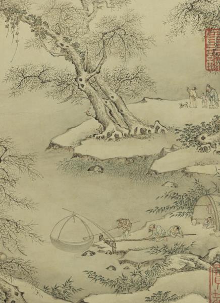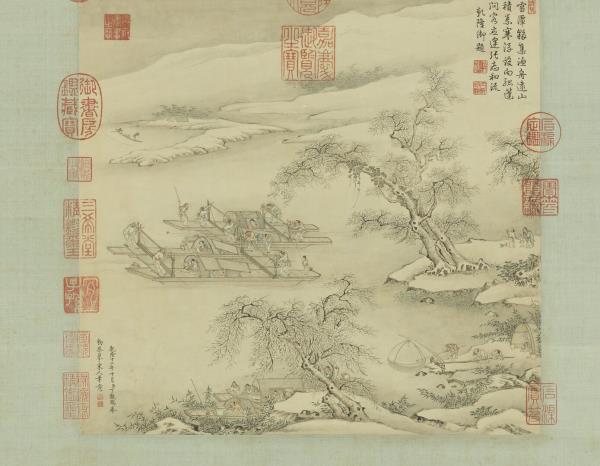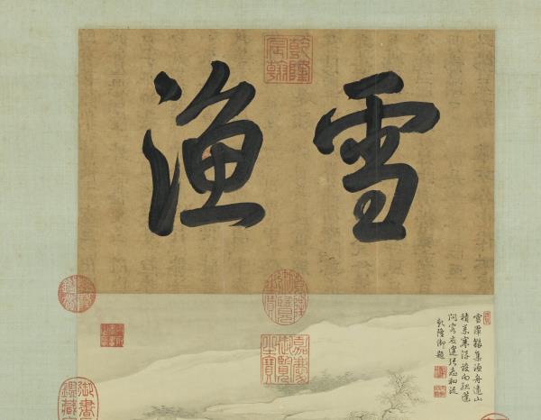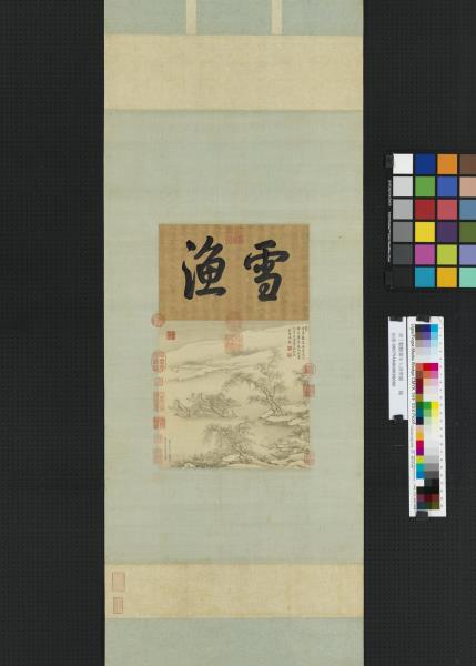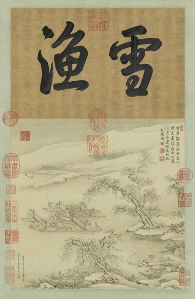 本幀畫寒山積雪,百木凋零,唯有岸邊的蘆葦臨風搖曳。江上漁舟群集,船家們或忙於張網捕魚,或拱手而坐,一派悠閒。而孩童或在船上快樂地玩耍,或依偎在母親的身邊,享受天倫之樂。詩塘上乾隆題寫的「雪漁」二字,當是本作最好的寫照。畫幅左側乾隆又書:「雪潭夥集漁舟,遠山積素寒浮。設向孤篷問客,應逢張志和流。」張志和是唐代擅於描寫漁父生活的著名詞人,末句「應逢張志和流」更將本幅的主題──漁樂一語道破。