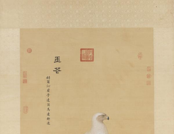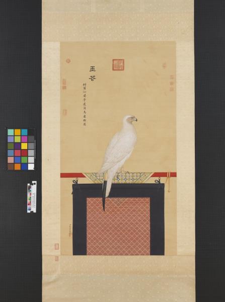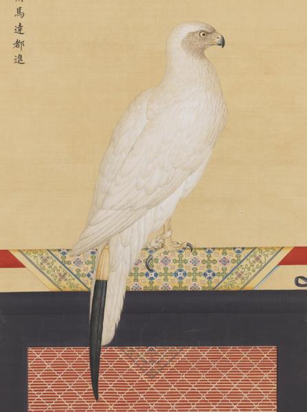 郎世寧(西元一六八八-一七六六年),義大利人,耶穌會教士,以繪畫供奉內廷。歷仕康熙、雍正、乾隆三朝。畫法參酌中西。 由畫上登題得知,白鷹是由蒙古柯爾沁部落首領達爾馬達都所進貢。郎世寧以光影分明的畫法畫出白鷹身上羽毛的光澤、及鷹架上不同質料織品所造成的不同觸感,並把物像拉近觀者,只露出鷹架的局部,意圖製造出一種生動的臨場感。