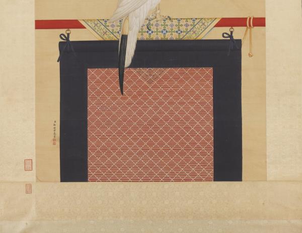 Lang Shih-ning was an Italian who at the age of 19 became a novitiate of the Jesuit Catholic order. At 27, he arrived in China as a missionary. With an art background, he also painted for the court under the K’ang-hsi, Yung-cheng, and Ch’ien-lung emperors. His style fuses Chinese and Western techniques. The title of this work indicates that this white falcon was presented as tribute from the chief of the Korchin tribe of Mongols. Castiglione used the technique of light and shadow to render different textural qualities suggested by the lustrous plumage of the falcon and the textile draped over the stand upon which the bird is perched. He also moved the focus closer to the viewer, revealing only part of the stand to create a lively effect as if actually there.