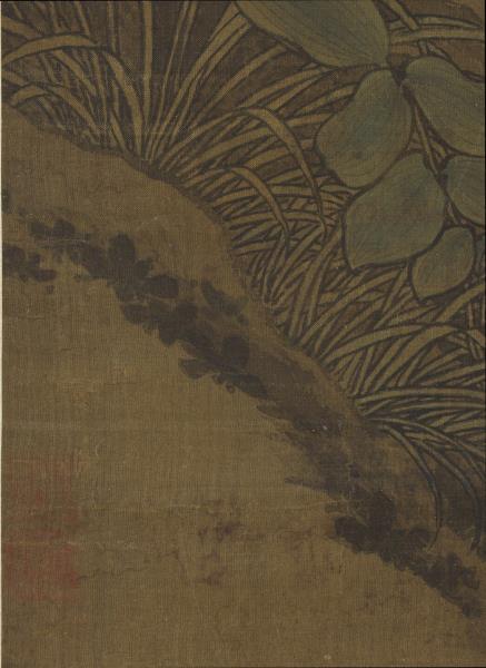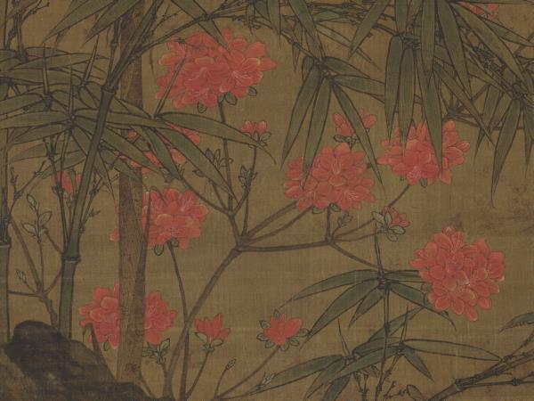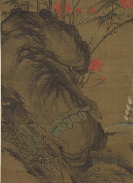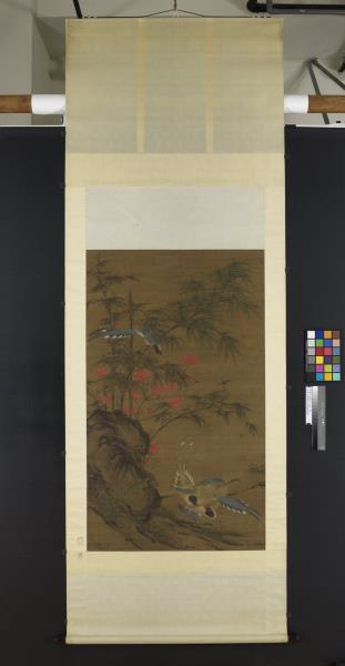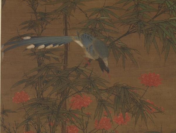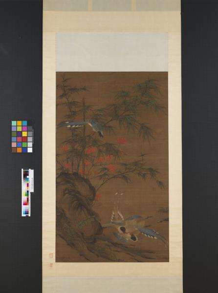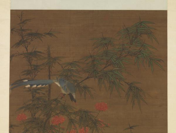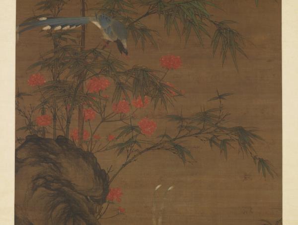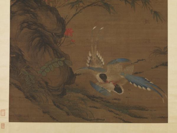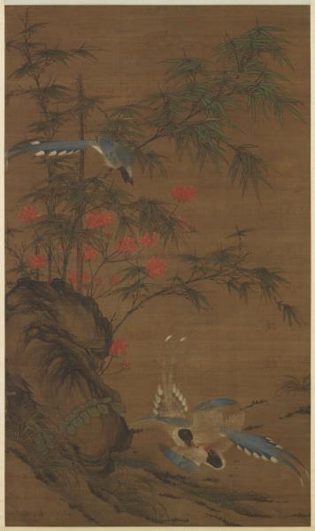 邊文進(活動於1356-1428 之間),字景昭,福建沙縣人,祖籍甘肅隴西。在永樂尚未遷都時已入畫院任職,而後在北京擔任武英殿待詔,宣德間召入文思院,值謹身殿待詔。 明初花鳥以邊氏最有名,曾被譽為「禁中三絕」之一,邊氏繼承宋代院體花鳥傳統,以工筆寫生取勝。此圖以雙鉤填彩,設色妍麗,綠竹茂盛,經營位置疏密變化多。湖石輪廓採披麻皴,繪羽毛敷染技法細膩,表現出質感與色感。山喜鵲一隻立於竹,兩隻相搏於地,或鳴或嬉,仰俯側反,能捕捉其情態。(林莉娜)
