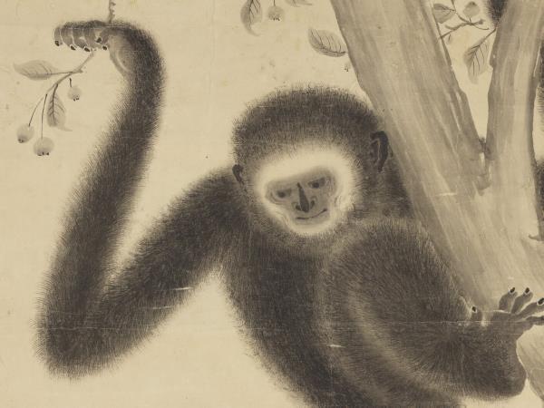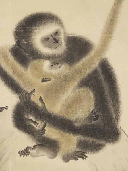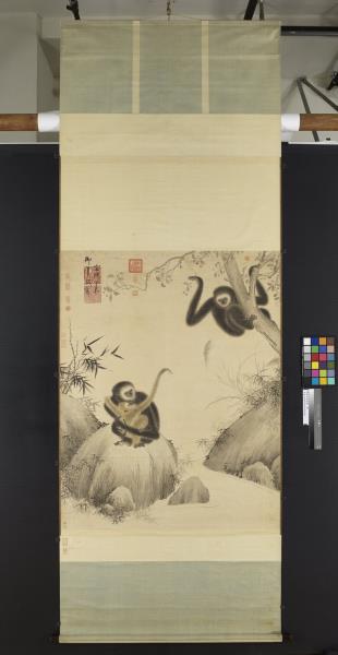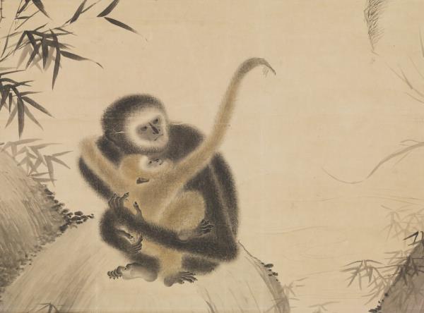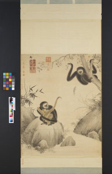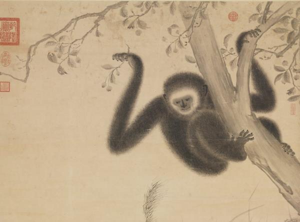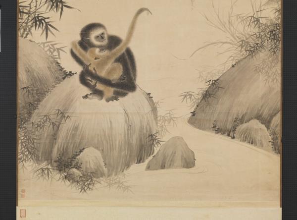 明宣德帝(1399-1435)、朱瞻基、詩文や書畫を好んだ。落款によれば、本作は宣德2年(1427)、宣德帝29歳の時の作品である。猿一家の和やかな様子が溫かな筆致で生き生きと描かれている。子猿を抱いた母猿が石の上にうずくまっている。まだ幼い子猿は母猿の首に左手を回してしがみつき、せせらぎを隔てた樹上の父猿に向かって右腕を伸ばしている。父猿は手に果実を持って子猿の気を引いている。3匹の猿の姿はそれぞれ異なり、表情も生き生きとしている。猿の毛並みは墨の濃淡乾湿を巧みに生かして質感が表現されている。猿たちを引き立てるイバラや笹の葉、アシ、波紋などの線もごく自然に描かれている。(20120407)