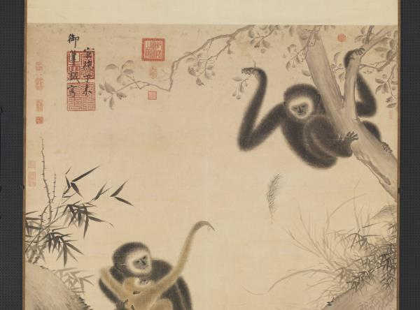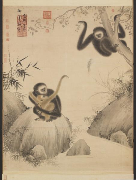 The Ming emperor Xuanzong (Zhu Zhanji) enjoyed composing poems and doing paintings. According to the signature on this work, it was done in the second year of the Xuande reign (1427) by Xuanzong at the Chinese age of 29. It vividly and warmly depicts joy in the relationships found in a family of gibbons. Squatting on a rock, the mother gibbon clasps her baby, the father having plucked loquats for them. The youth has its left arm around its mother's neck and reaches out for the fruit teasingly presented by its father on the other bank of the stream. The varied poses of the gibbons with their animated expressions and actions are complemented by the expressive texture of fur rendered ingeniously with light and dark as well as wet and dry applications of ink. The lines for the thorny shrubs, bamboo, reeds, and water ripples in the setting are also natural and fluid.(20120407)