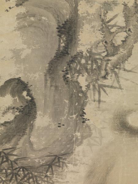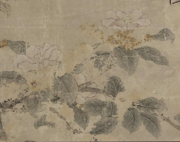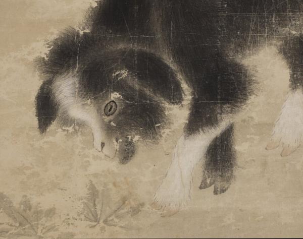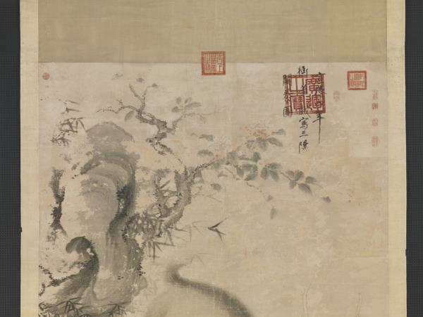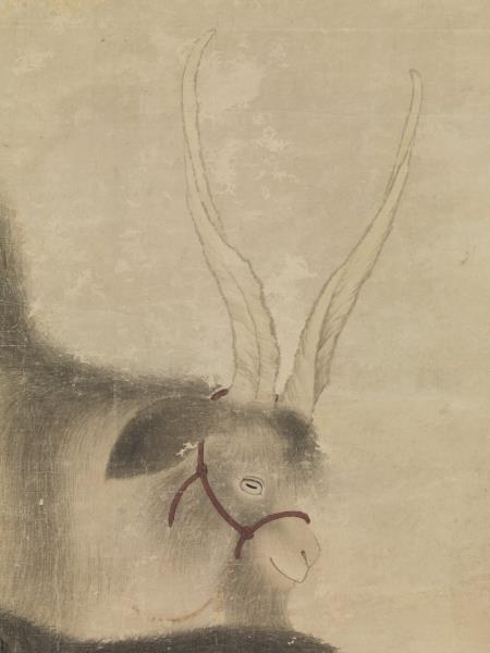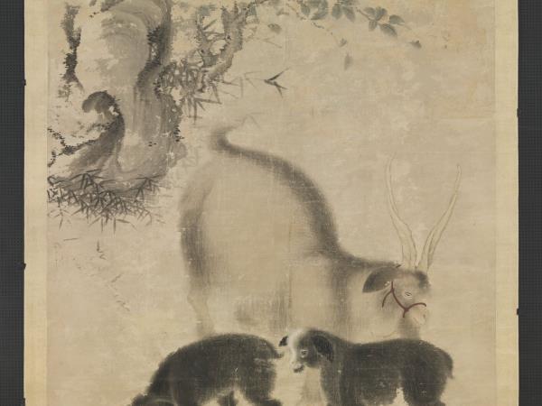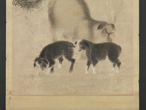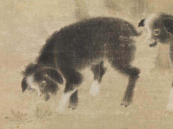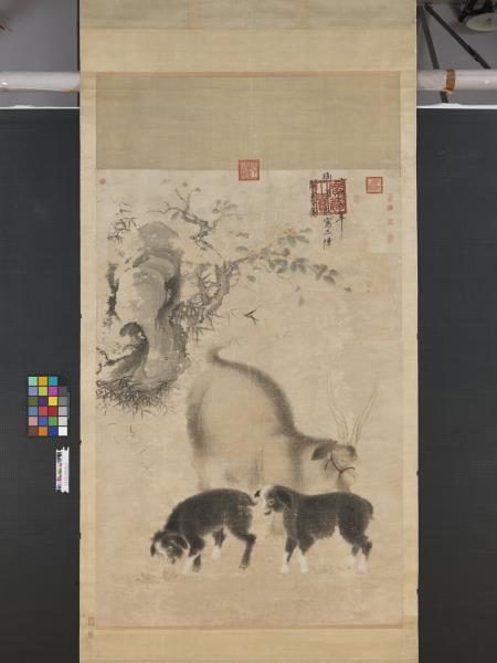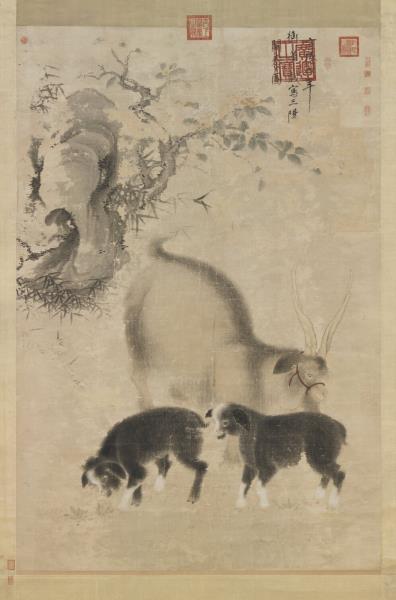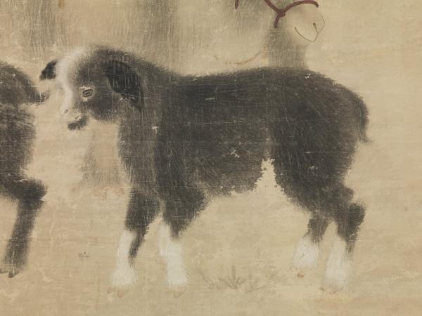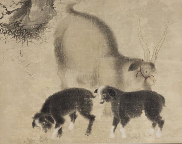 Emperor Xuanzong (personal name Zhu Zhanji) was able to produce free and natural works of painting and calligraphy, resulting in him often being compared to Huizong (1082-1135), the Northern Song emperor most renowned in Chinese history as an artist. In this ink painting with light colors from the fourth year of Xuanzong's reign (1429) are a ewe and two lambs with a background of bamboo, rocks, and camellias. The subject of three goats is a homophone for "Three Yang, an Auspicious Start to the New Year." This title comes from the Book of Changes, which consists of 64 hexagram (six-line) combinations of trigrams (three-line symbols). The eleventh hexagram translates literally as "Earth (and) Heavens (at) Peace" and is represented by the symbol . With the three lines of qian (yang) below and three of kun (yin) above unified and harmoniously connected, it symbolizes peace throughout the heavens and earth. Of the twelve lunar months, the first is when peace takes up residence, marking the end of winter and the beginning of spring when yin is eclipsed by yang, indicating an auspicious sign.(20120407)