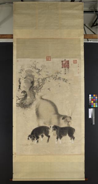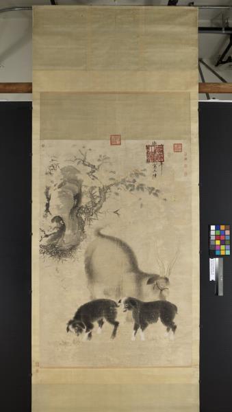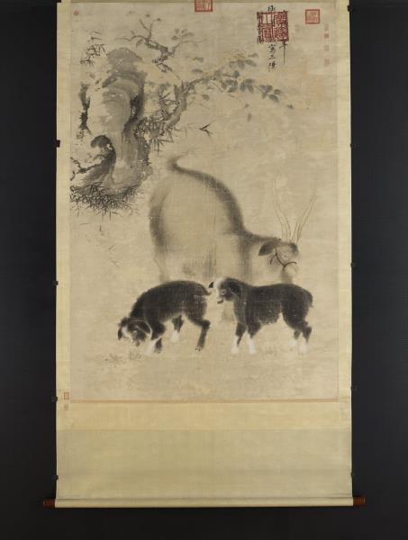 明宣德帝(1399-1435)、朱瞻基。その書畫はごく自然な作風で、宋徽宗帝(1082-1135)と比較されることが多い。本作は宣德4年(1429)のもので、淡い色彩で母ヤギと小ヤギ2頭が描かれており、竹や岩石、椿が添えられている。この作品には、語呂合わせで「三陽開泰」という吉祥の意が込められている。「三陽開泰」は易経六十四卦の第十一卦「地天泰」から取られている。この卦象乾下坤上は天地上下が深く交わる世の安泰を意味している。十二ヶ月の中で泰卦は正月にあたり、冬の終わりと春の訪れを表しており、陰が消え陽が生じ諸事順調に運ぶ吉象を示している。(20120407)