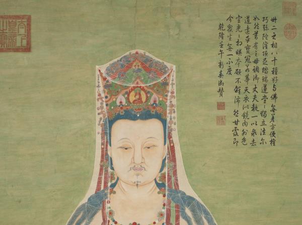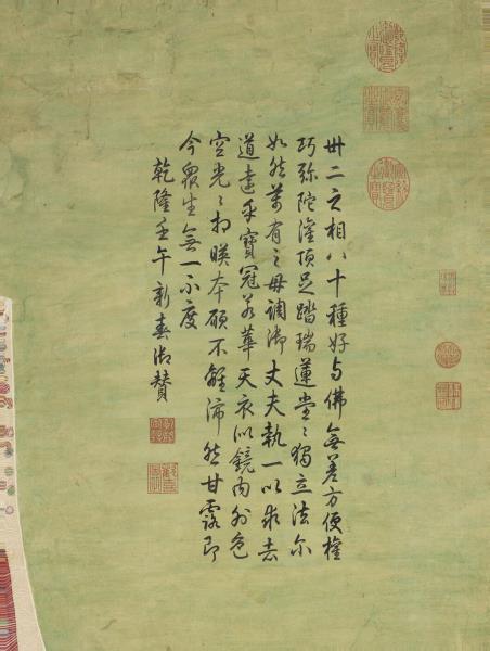 題跋 清高宗 印記 expand_more 本幅 乾隆壬午新春御贊 行書 卅二之相。八十種好。與佛無差。方便權巧。彌陀灌頂。足踏瑞蓮。堂堂獨立。法爾如然。萬有之母。調御丈夫。執一以來。去道遠乎。寶冠若華。天衣如鏡。內外色空。光光相映。本願不離。沛然甘露。即今眾生。無一不度。乾隆壬午新春。御贊。