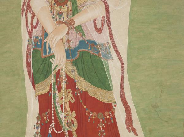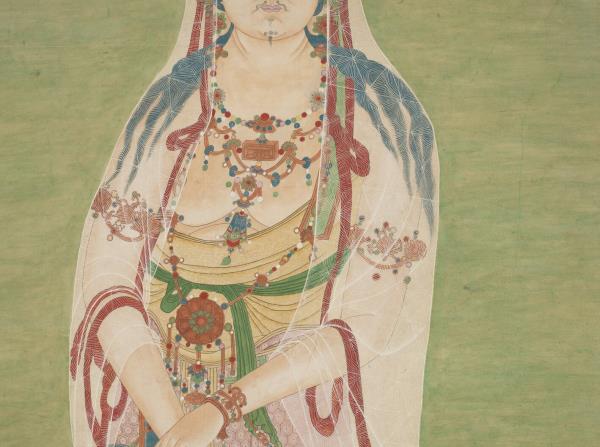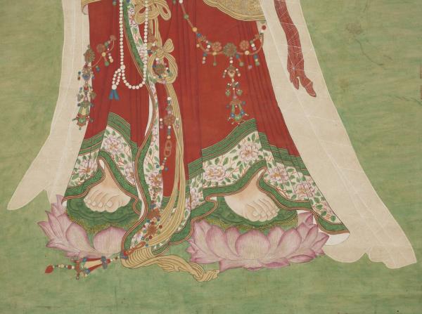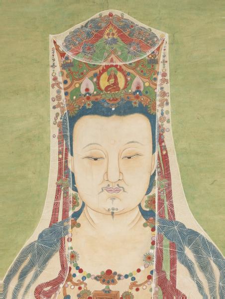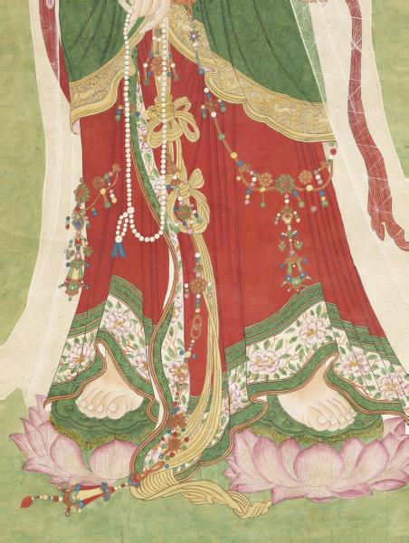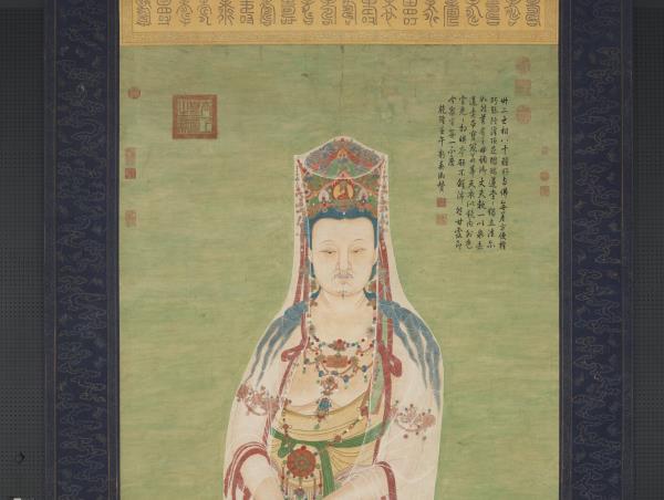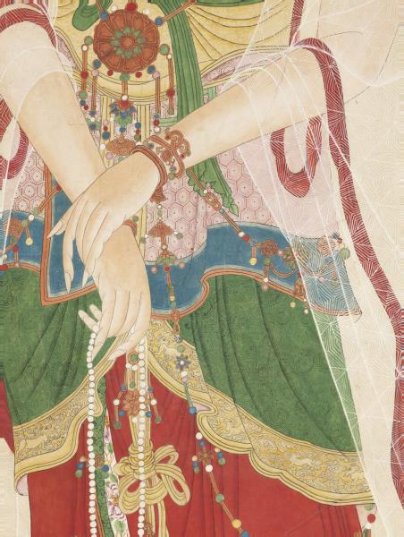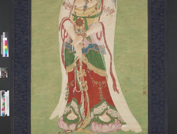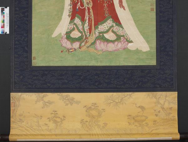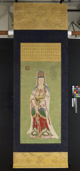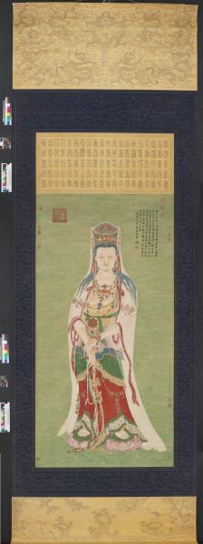 Description Kuan-yin's bluish hair is draped over the shoulders in this painting. Kuan-yin, wearing an opulent crown with a seated Buddha, is adorned with all sorts of jewels and is covered with a semitransparent cloth. The coloring is rich and the portrayal quite delicate and fine; no detail of the clothing pattern has been left out. Furthermore, the exposed parts of the body have all been rendered with washes, imparting a sense of volume to the figure. Although the signature of Ting Yun-p'eng appears along the middle lower right border, the style indicates that it was probably done by a later painter of the 17th or 18th century working from an older model. Thus, the signature of Ting Yun-p'eng was added at a later date.