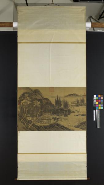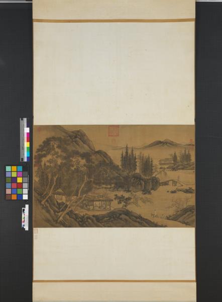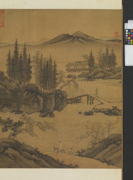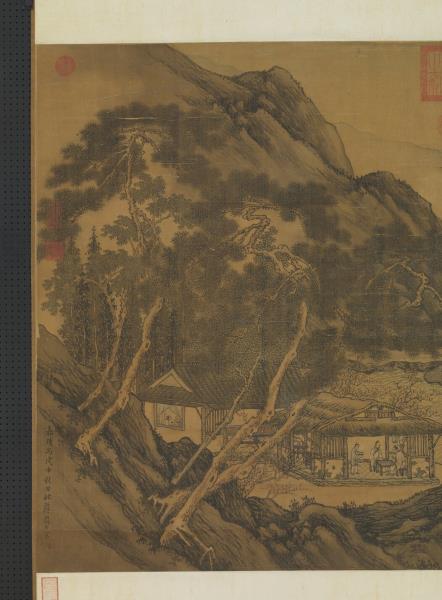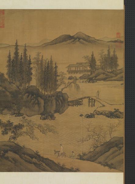本幅畫坡上虯松數株,二人專心對弈於岸邊草廬之中,一人騎驢而至,驢後童僕持琴隨行。全作墨色濃重,筆觸銳利,構圖層次分明,誠為周臣傳世佳作。