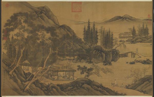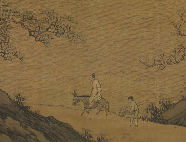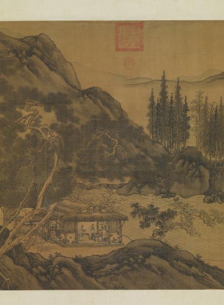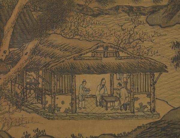In this painting are several pine trees standing on a hillside. Two figures concentrate on their game of chess in a thatched hut. A figure rides a donkey, and a boy servant carrying a lute follows behind. The entire work has been done with dark ink and the brushwork is sharp and the layers of the composition well defined, making this an exceptional work by Chou Ch’en.
