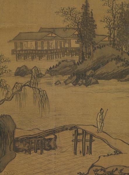 周臣(約西元1450-1535年),江蘇吳縣人。字舜卿,號東村,善山水人物。山水師陳暹,間傳宋人畫法,得力於李唐、劉松年、馬遠、夏珪。用筆純熟縝密,風骨峭勁雅健,嘗傳授筆法與唐寅、仇英。