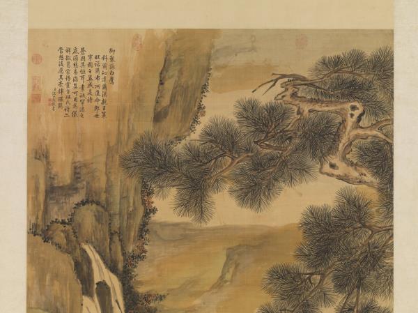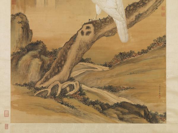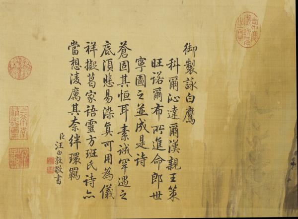 御製詠白鷹。科爾沁達爾漢親王策旺諾爾布所進。命郎世寧圖之。並成是詩。蒼固其恒耳。素誠罕遇之。底須悲易染。真可用為儀。祥擬葛家語。靈方班氏詩。亦當想凌厲。其奈絆環羈。臣汪由敦敬書。 |