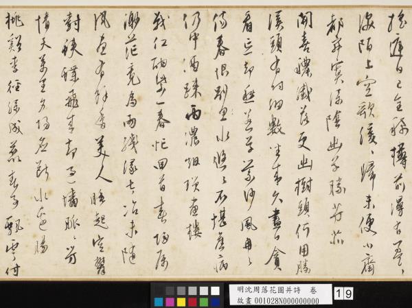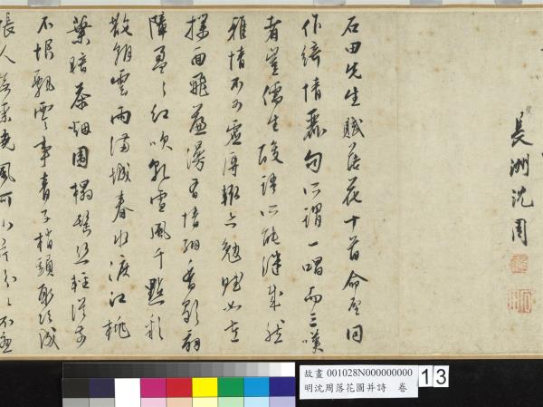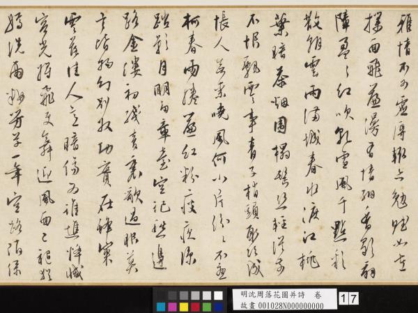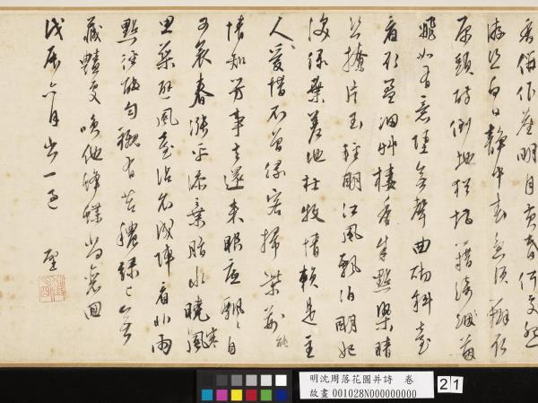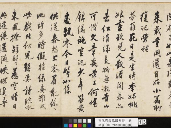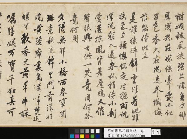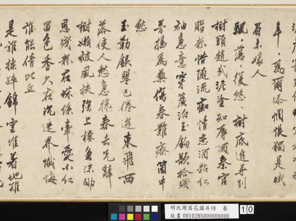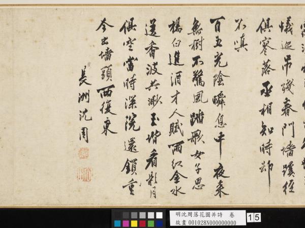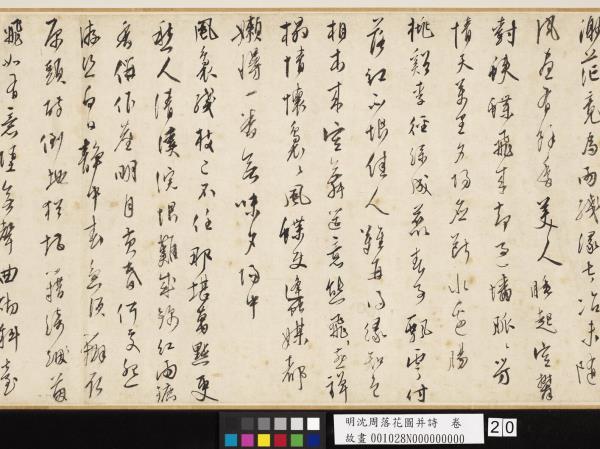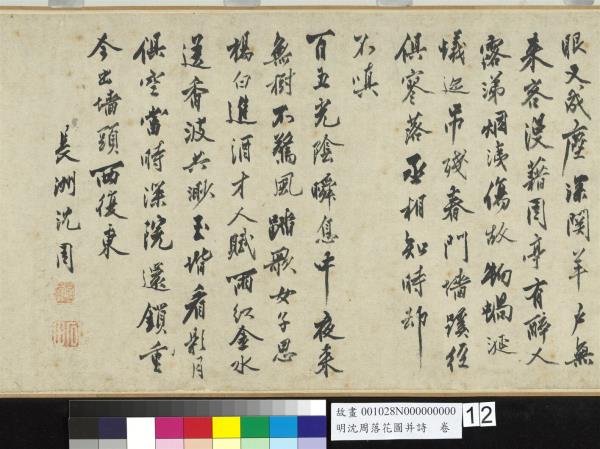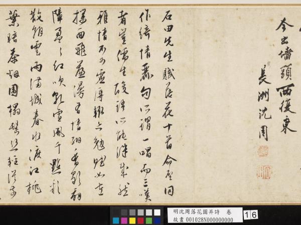 沈周(西元一四二七-一五0九年),長洲(江蘇蘇州)人,字啟南,號石田、白石翁。詩書畫兼擅,明四大家之一。 甲子(一五0四)年春,沈周賦落花詩十首,以示文徵明。徵明與徐禎卿、呂、唐寅皆和之。此幅落花圖為沈周所作,並自書落花詩十首,文徵明書其和章。沈氏書畫皆未署年款,文徵明署年戊辰(一五0八)六月,是年沈周八十二歲,文徵明三十九歲。