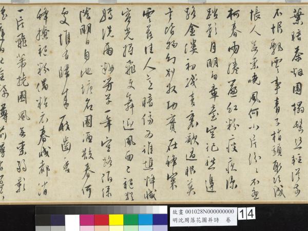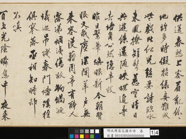 何炎泉、陳階晉、陳韻如,〈明沈周落花圖并詩 卷〉,收入《明四大家特展-沈周》(臺北:國立故宮博物院,2014.01),頁210-215、329。
