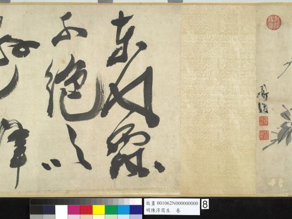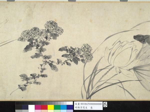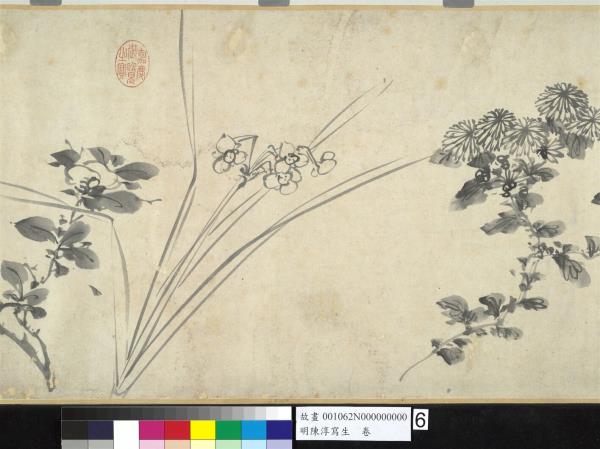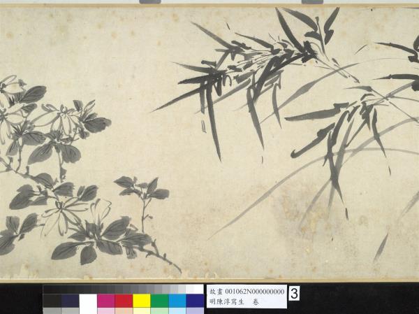 陳淳(1484-1544),江蘇長洲人。字道復,後來以道復而聞名,改字復甫,號白陽山人。畫家天資聰穎,才華甚高,凡經學、古文、詩詞、書法,無不精研通曉。嘗從文徵明學書畫,極得文氏的讚許。畫擅長寫意花卉,尤妙寫生,後人把他同徐渭並稱「青藤、白陽」,代表明代中期水墨寫意花卉畫的新格調。亦畫山水,筆迹放縱,對後世水墨寫意畫甚有影響。 將四季花卉數種,以折枝的形態穿插安置在手卷中,這是明代畫家描繪花卉所常用的表現手法。依幅後拖尾自題,此卷作於1538年,年55歲。幅中折枝牡丹、蘭、竹、槴子、荷花、水仙、山茶,並未安置在同一水平線上,高低遠近又相互呼應的擺設,使構圖活潑而生動。無論一筆揮就的中鋒線條或是側臥的墨點塊,皆因水份飽滿,濃淡墨色極具變化且行筆快速,而呈現豪邁放逸的筆調。在花卉造型上,鈎花點葉的表現法,葉片呈正面平展,無向背,鈎勒葉脈的線條使轉自由率性,這些都是畫家個人風格的表現。在畫本幅之後,又接了一段畫家草書七言古詩一首,筆蹤瀟灑,有筆飛墨舞之姿。詩圖相契,可視為畫家晚年畫風的代表之一。(張華芝)