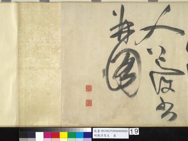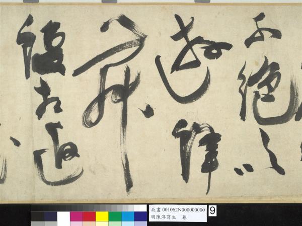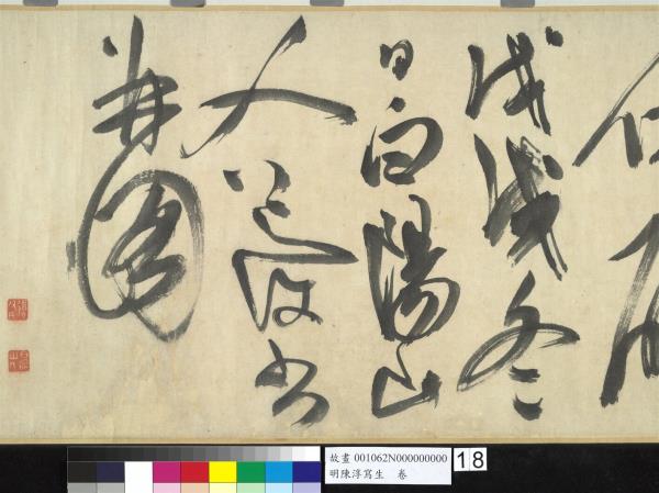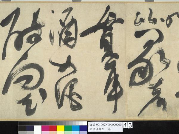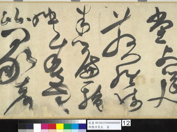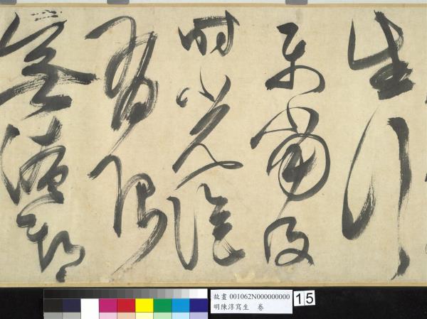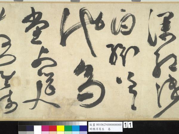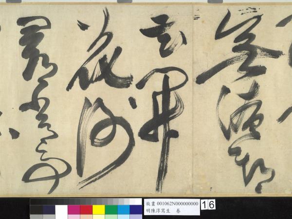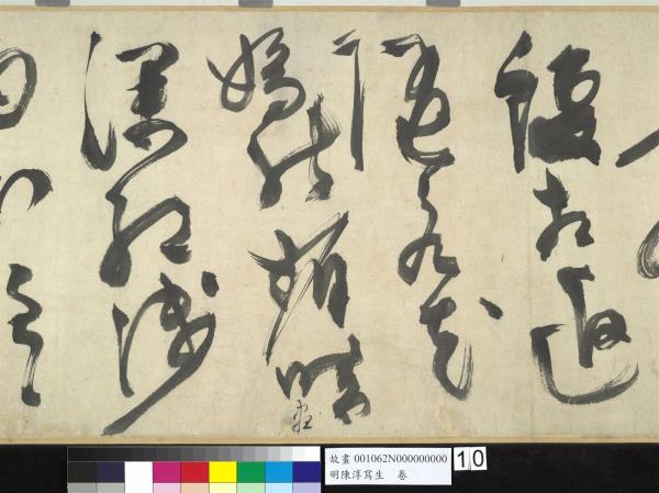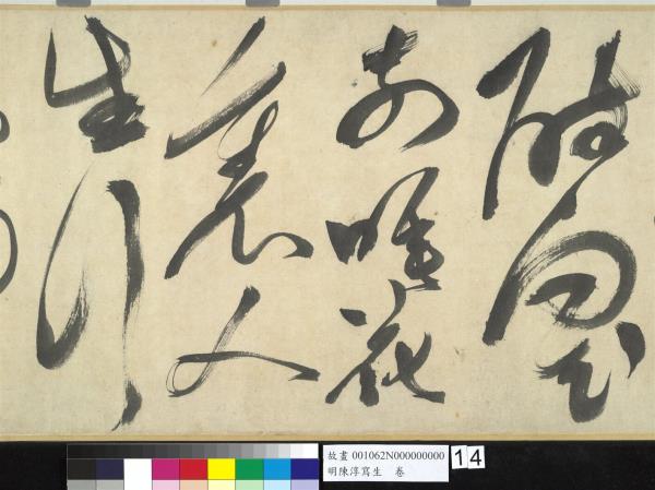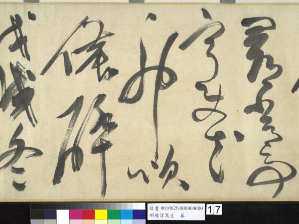 陳淳(1484-1544)是明代中期,蘇州地區的藝術家,兼善詩、書、畫三藝。他曾以諸生資格貢入太學,卒業後,放棄作官的機會,回到蘇州,過著縱情於藝術創作的生活。 這件草書寫於五十五歲(一五三八),每行一字至三字,運筆提頓扭轉,左傾右倒,或節制或奔放,如醉歌狂舞,縱橫爭折,毫穎分叉,不加修飾的筆觸,形成若虛若實的飛白筆畫,極富律動的美感。(拖尾之陳淳題草書詩)