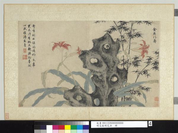 文徵明,江蘇長洲人。初名壁,字徵明,後以字行。亦字徵仲,號停雲生、衡山居士。詩文書畫並佳,畫師沈周,為明四大家之一。金英指的是畫上的萱草,就是通稱的金針花,也叫作「忘憂草」。文人喜愛在庭園或案頭佈置太湖石,奇形怪狀又漏空的石頭,猶如抽象的雕塑品,突立在眼前,石頭後方橫斜著朱紅的金針花,和修長的竹子,視覺上前暗後明,層次分明。本幅為徵明于明世宗嘉靖十二年所作,時年六十四歲。因是年夏季,受徐縉之邀,避暑於洞庭西山堰下縉宅,於清談酣適之際,乘興點染窗間名花異卉,或綴以奇石,乃成此冊。通幅筆力挺健,運筆靈活多變,極富生意。自題亦挺勁且結體優美,當是徵明書法得意時之作品。(王耀庭)