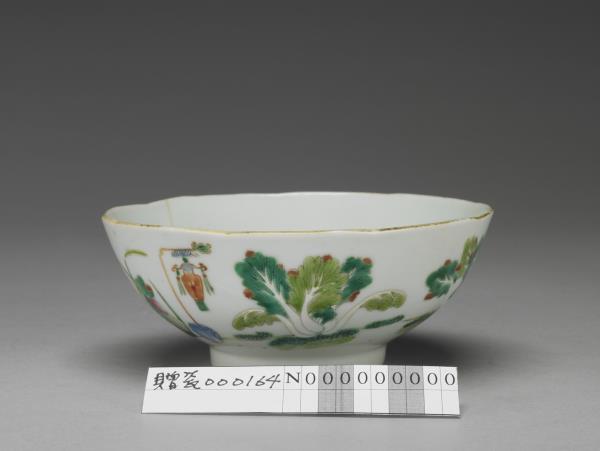 花口碗,深弧壁下斂,圈足。器外釉上彩繪白菜、荷花數叢,白菜與荷花圖像幾乎等大,並且位於為於同樣平面,造成遠近無別的剪貼效果。荷花與白菜間,見有一弔掛花瓶的支架,或許指向「平安」一類的吉祥意涵。內底心繪桃實,或有添壽一類的吉祥意涵。足緣露胎一圈,圈足內紅料書「同治年製」二行四字單方框篆款。