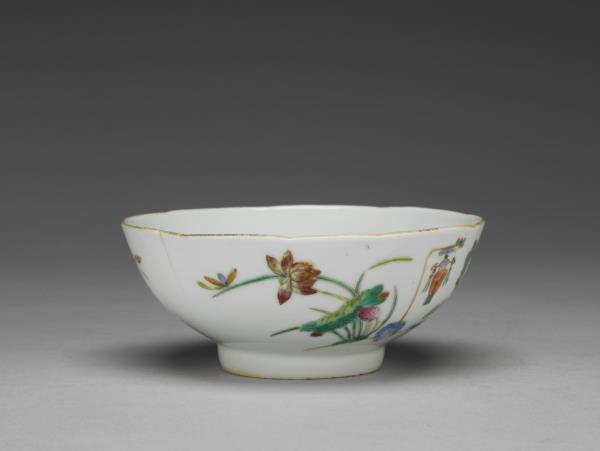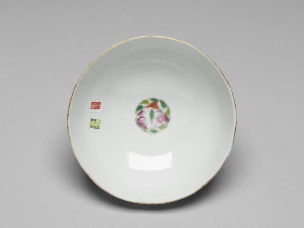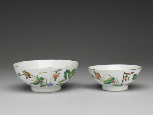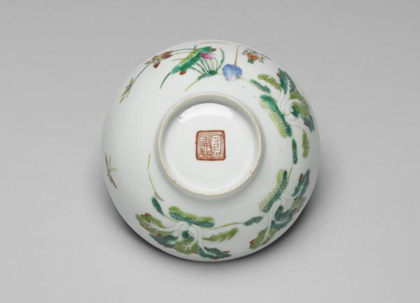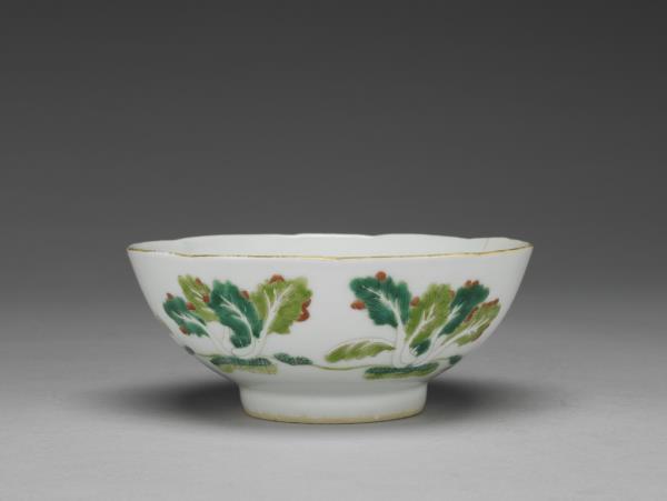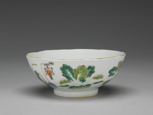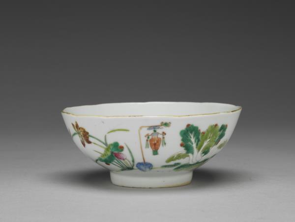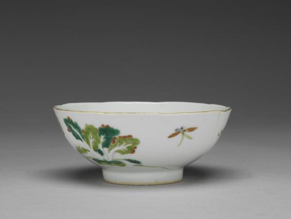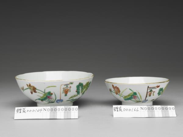 | 說明 | 花口碗,深弧壁下斂,圈足。器外釉上彩繪白菜、荷花數叢,白菜與荷花圖像幾乎等大,並且位於為於同樣平面,造成遠近無別的剪貼效果。荷花與白菜間,見有一弔掛花瓶的支架,或許指向「平安」一類的吉祥意涵。內底心繪桃實,或有添壽一類的吉祥意涵。足緣露胎一圈,圈足內紅料書「同治年製」二行四字單方框篆款。 |