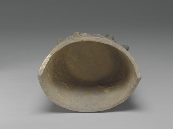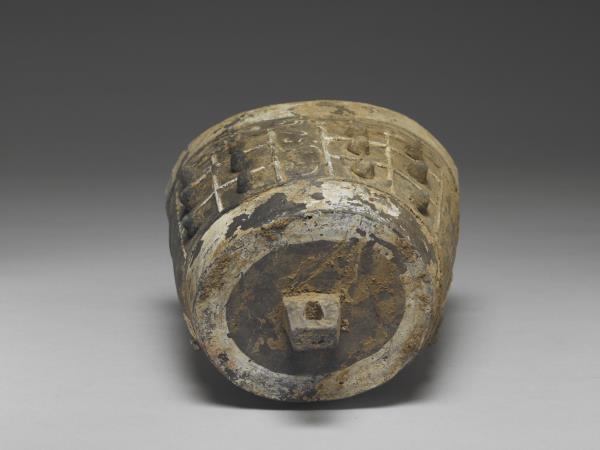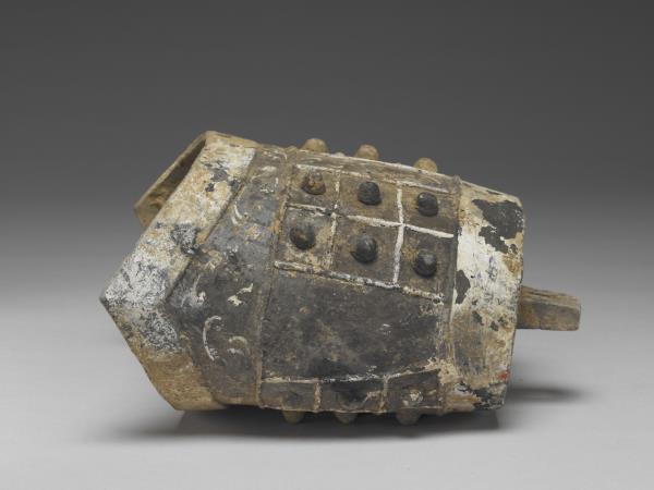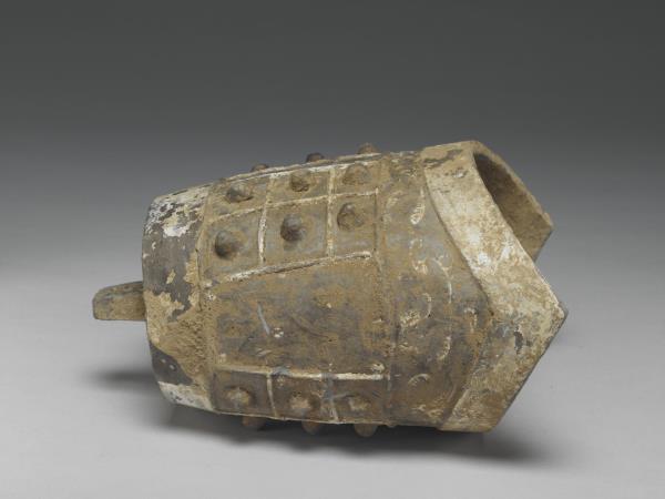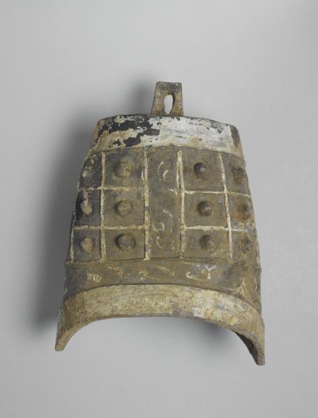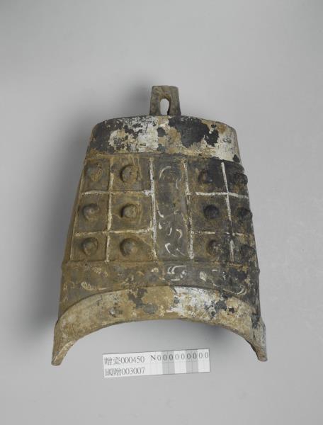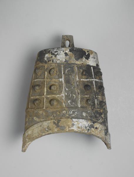 陶鐘,器型仿青銅器編鐘,方鈕,鐘身有二十四枚,上下緣塗白陶衣,鉦部及鼓部有白陶衣紋飾,已漫渙不清,部分可能是動物類紋飾。