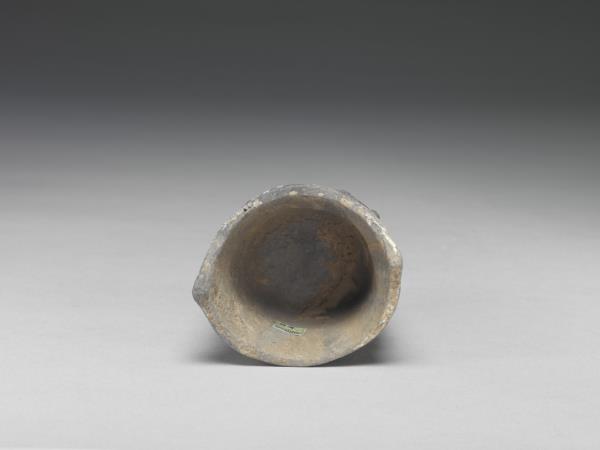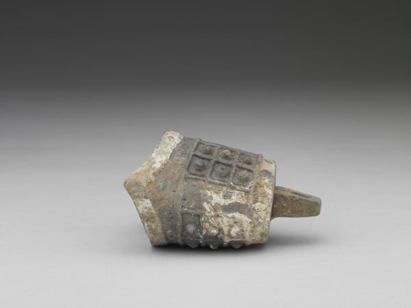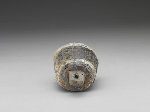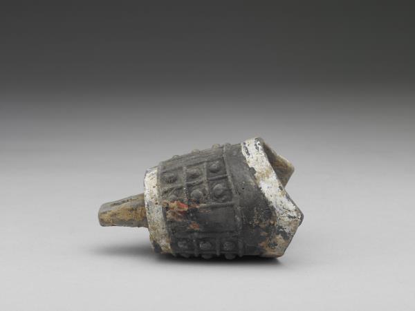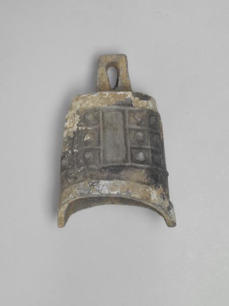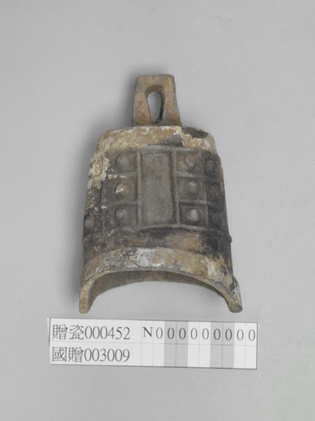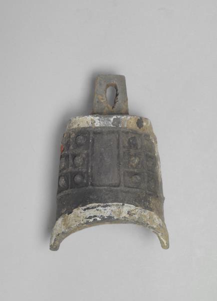 陶鐘,器型仿青銅器編鐘,方鈕,鐘身有二十四枚,上下緣塗白陶衣。