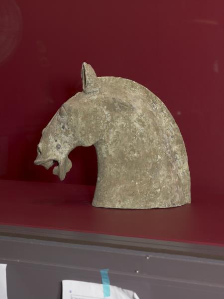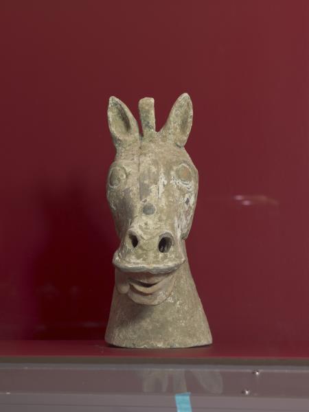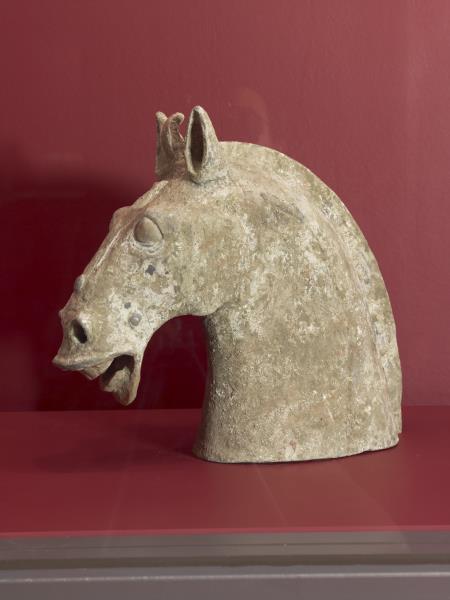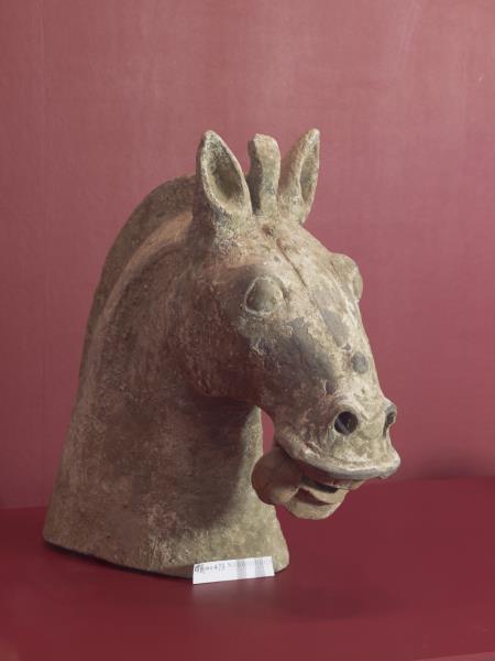 | 說明 | 陶馬,體型短小。長臉,骨棱分明,眉脊高聳,鼻翼奮張,圓目,張嘴吐舌作喘息狀。粗頸寬胸,平背圓臀,腕粗蹄闊,雙耳高聳。額前鬃毛成束,後腦馬鬃披頸,剪短豎起。尾作弧形上翹,末端打結。四足穩立,矯健有力。肌肉結實,呈現漢代駿馬的體態。塑者捕捉馬在停歇喘息的瞬間,活潑生動。馬匹原為赭紅色,局部尚留白色粉底及朱彩。 陶馬為漢代事死如事生概念下的陪葬品,大量出現在四川、河南、河北等地。本作品與四川樂山崖墓東漢墓出土的陶馬造型類似。由墓葬出現狀態觀察,此類體態優美的馬匹可為坐騎、軺車乘馬,也盛裝作儀隊用馬。據說是健步如飛的汗血馬,西漢武帝(西元前157-87年)為獲取此類馬匹曾兩次西征大宛國(今土庫曼斯坦阿什喀巴城)。 |