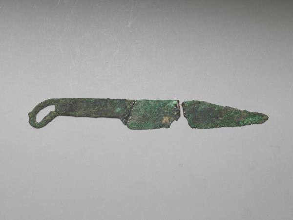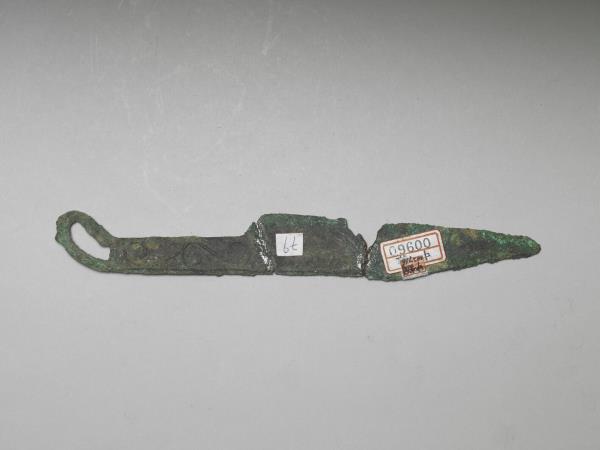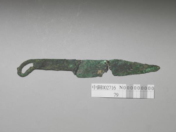 銅製戈,上刃平直,下刃斜,無胡,無欄,直內,內部尾端帶一環。內身單面飾幾何型圖案。全器鏽蝕,刀身斷裂。