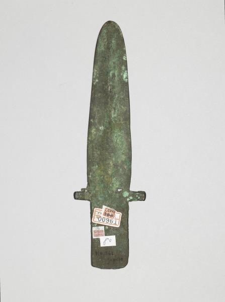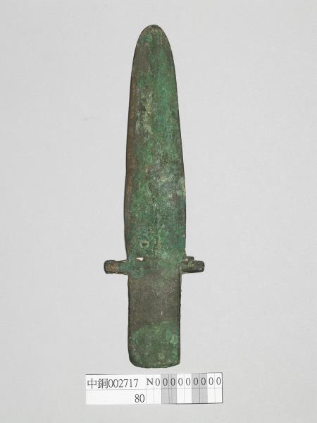 銅製戈,援底與內同寬,上下刃及尖端皆磨成鋒刃,脊位於援身中間,無胡,帶上下欄,直內。全器鏽蝕,援身斷裂。柄部墨書「NO.361」、「sapele」。