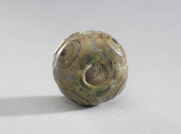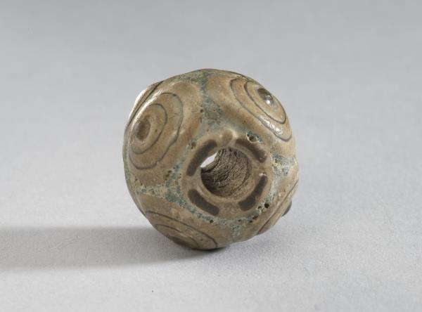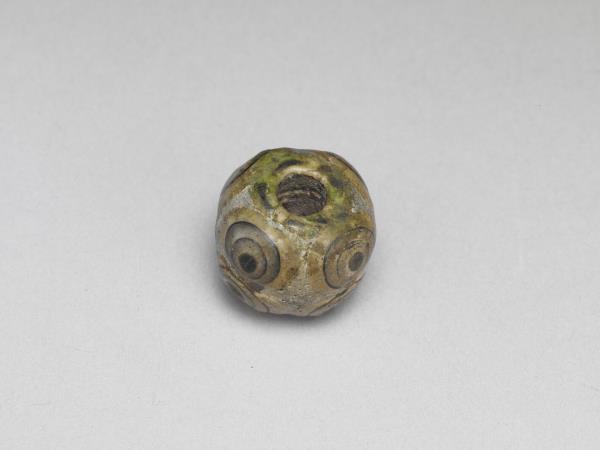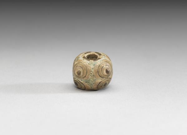黃褐色玻璃,製成圓柱形玻璃珠,中間帶一圓穿孔。玻璃珠表面填飾多圈黑色圓形紋,圓形紋中央皆嵌一顆黑色珠。玻璃珠表面多處帶小孔洞或殘缺剝蝕。玻璃珠在戰國墓葬出土中,常發現這種含圈紋多彩的珠子,俗稱蜻蜓眼的珠子,這類作品大致上應與道家燒造的琉珠相似,都是含有高鉛成分。