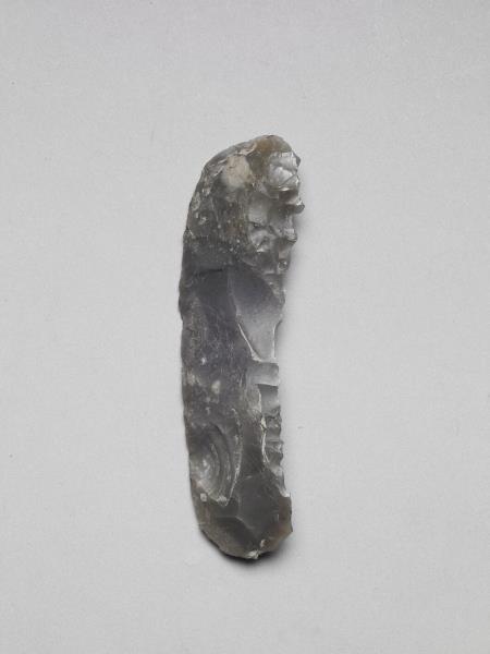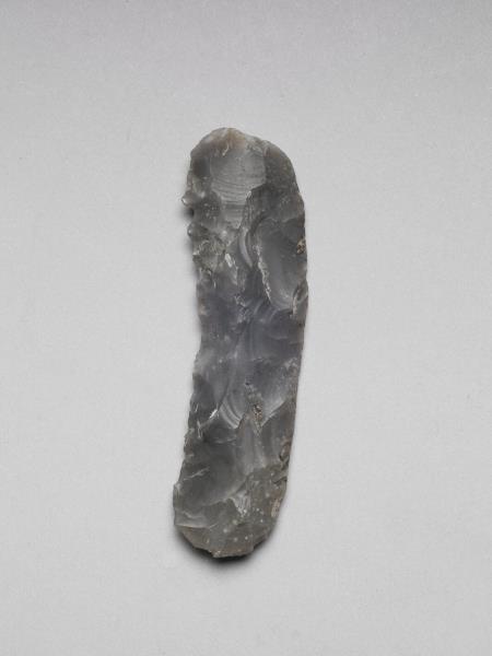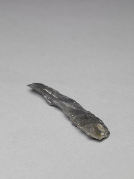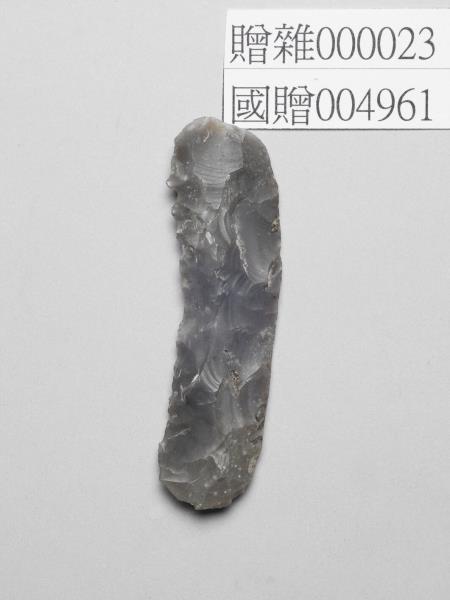 黑色石片,全器呈長條形,中體略厚,邊緣扁平,表面多處帶使用痕跡。